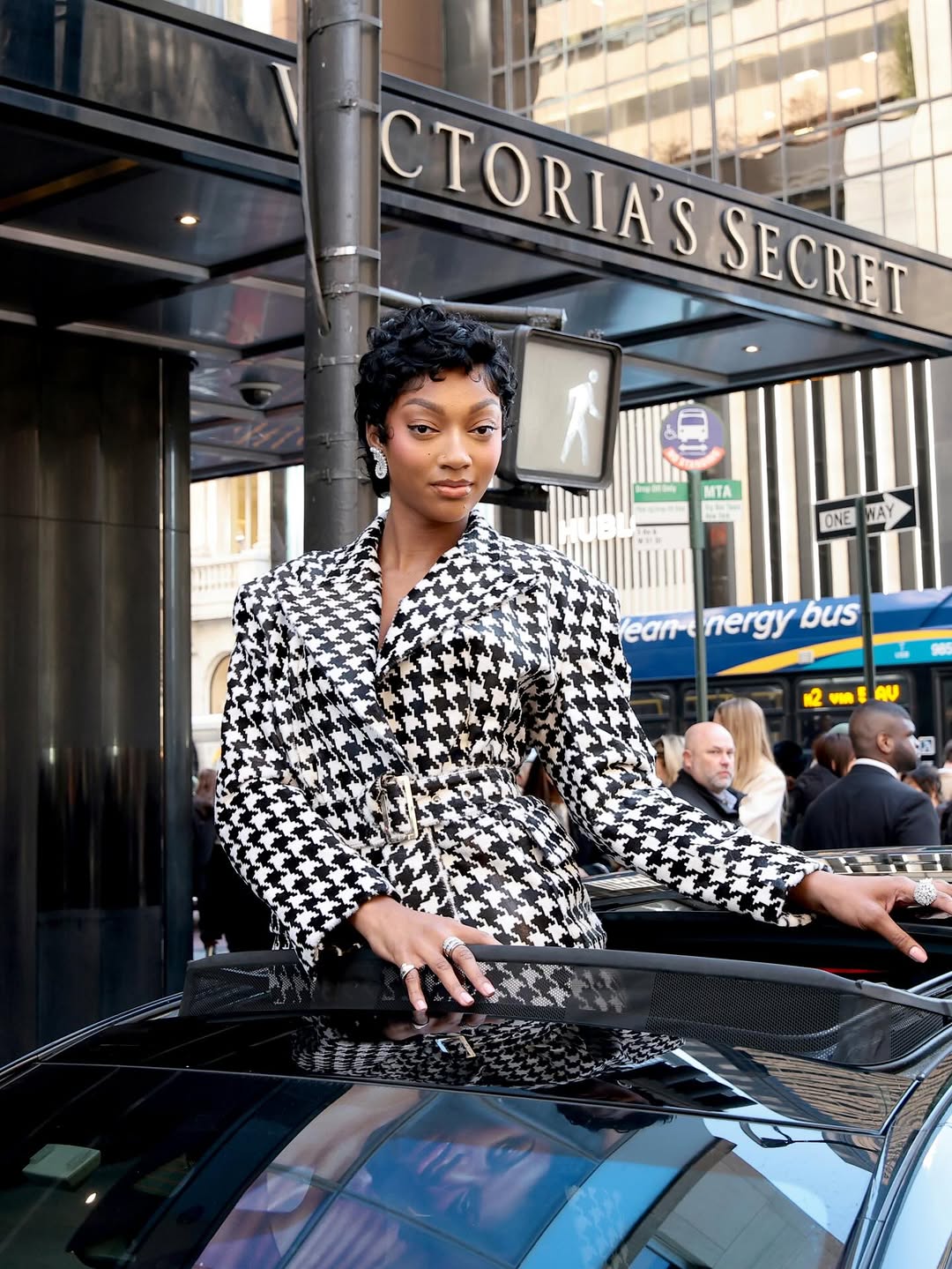Her outfit matched the vintage aesthetic with structured pieces. Styled by Matthew and Reginald Reisman, it included a black-and-white skirt suit by LaQuan Smith, with a Victoria’s Secret bra layered underneath. She wore Swarovski pearl stud earrings and pointed slingback pumps.
