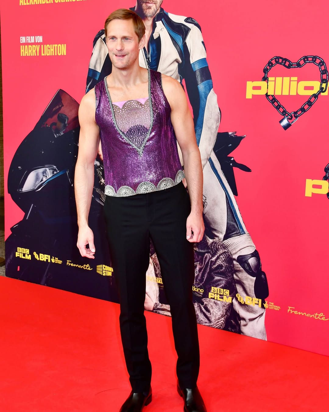 Alexander Skarsgård chose an unconventional menswear direction while attending the “Pillionscreening in Berlin, Germany. Working with stylist Harry Lambert, the actor moved away from standard tailoring typically seen on red carpets, choosing a look that is beyond classic suiting, with a sleeveless design and bold use of color.