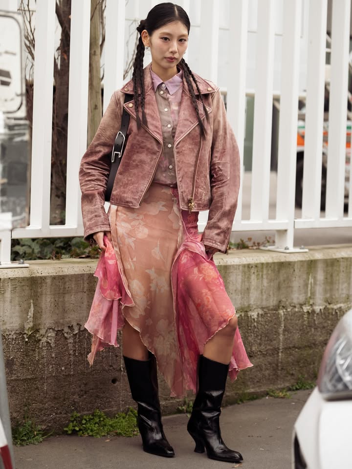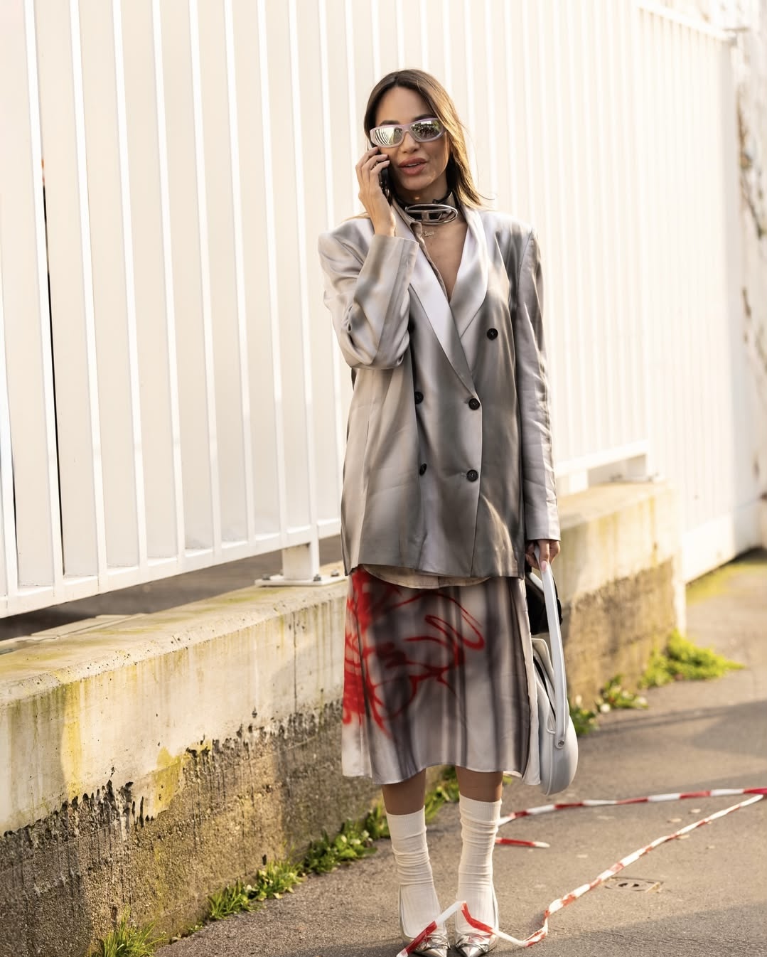 Layering was a common styling choice in among attendees. Many used blazers and jackets to add structure and dimension to their outfits, while some attendees paired socks with heels or boots, adding a layered look. Jackets were paired with underlayers or matching two-piece sets, showing fashion insiders combined pieces to create layered outfits.
