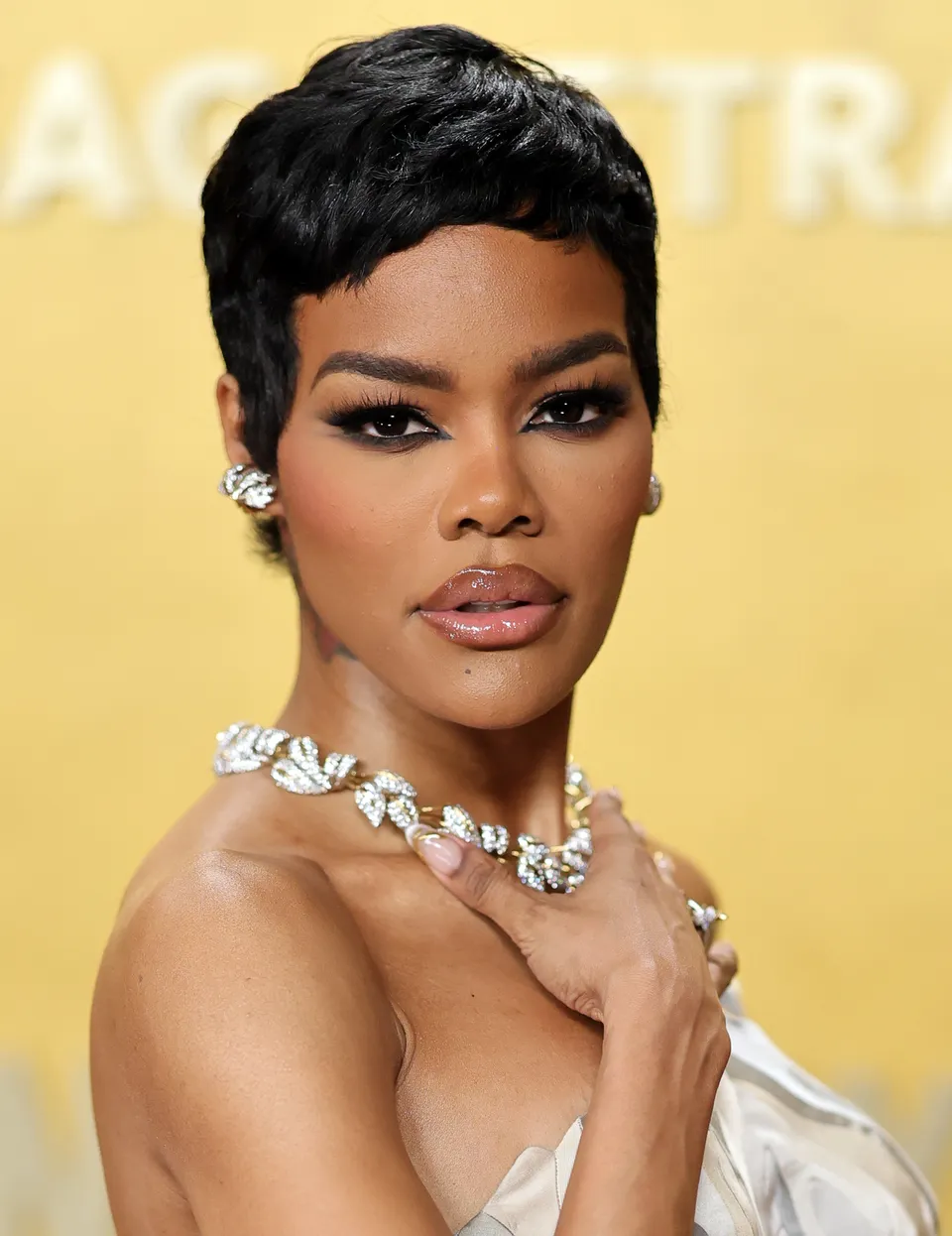 Teyana Taylor leaned into her signature glam with a short, wavy pixie cut. Her makeup, created by artist Yeika Olivia, featured a smoky eye paired with an ombré glossy lip. The look highlighted the bold beauty style she is known for.