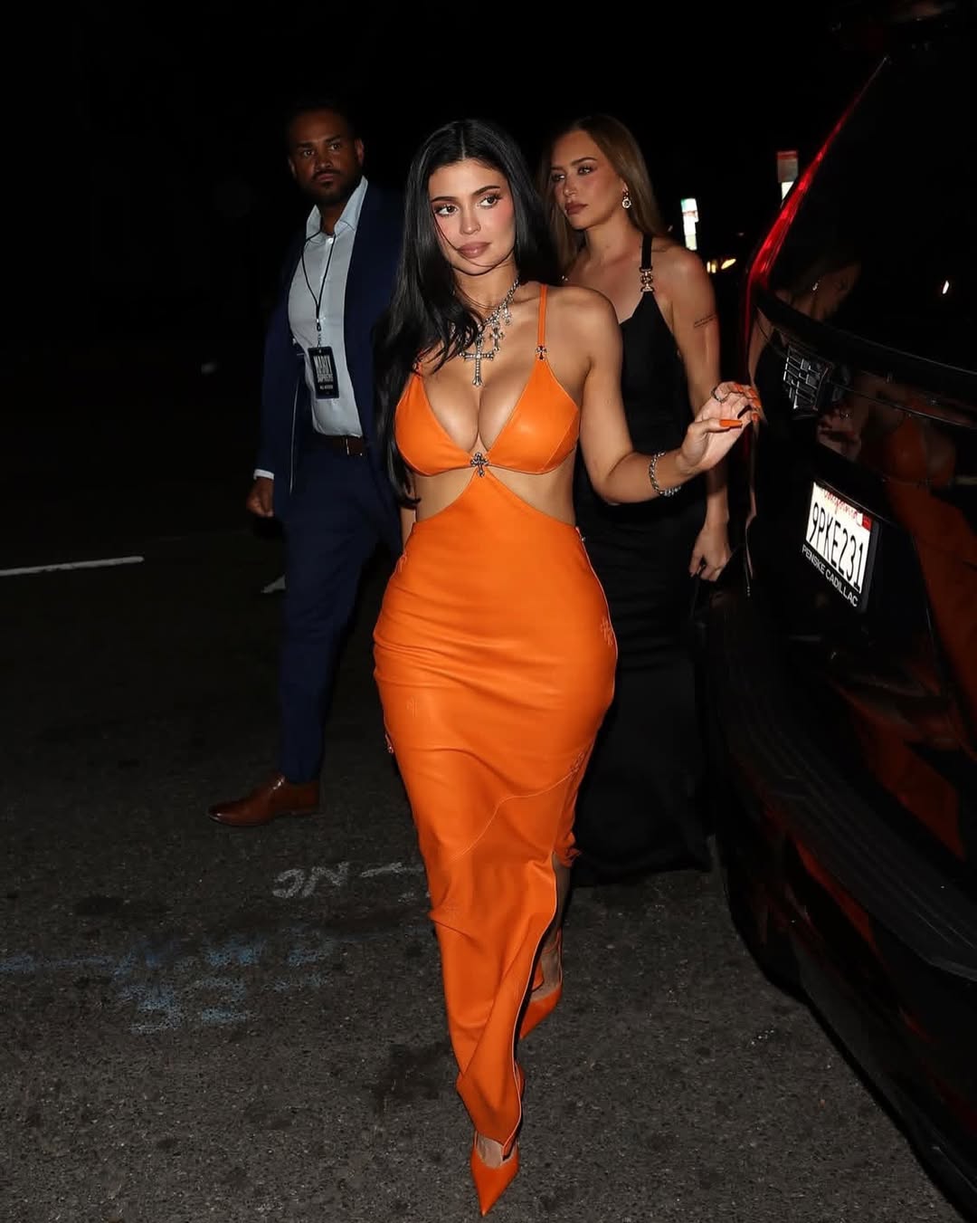 Jenner’s outfit consists of a floor-length orange gown with triangular cutouts at the waist and bust, a plunging neckline with cross embellishments. The beauty mogul wore the shade throughout that even her nails were painted. The look was completed with pointed orange heels and her makeup also matched the color.