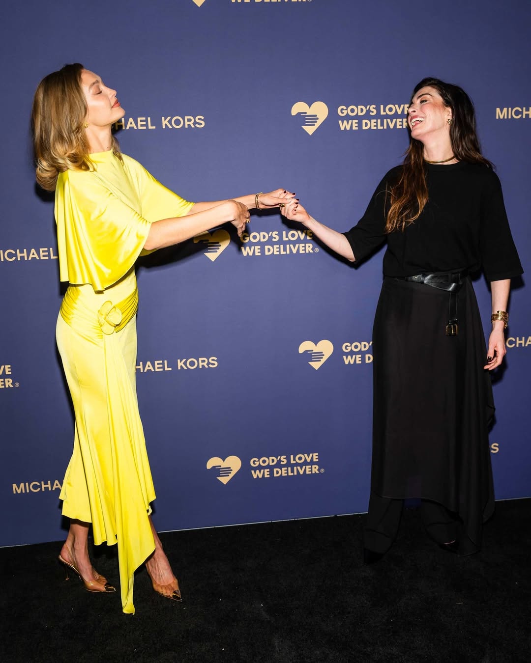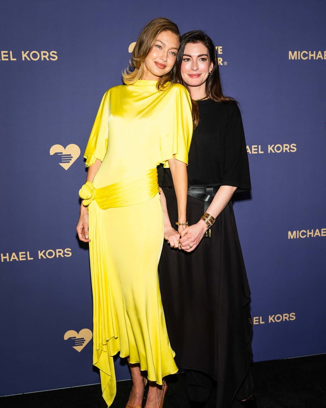 Before the event began, the longtime friends Anne Hathaway and Gigi Hadid both shared a sweet red carpet moment. They arrived smiling and posing together. Hadid was dressed in a bright yellow David Koma piece featuring a high neckline and a sash-like waistband adorned with a single flower design at the side.