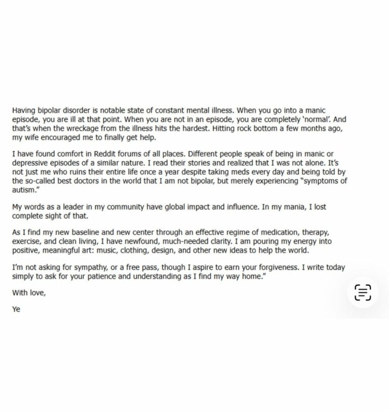 Ye said he is now receiving professional care, including medication and therapy. He reflected on a prolonged manic episode in 2025, which he said led to some of his most damaging public behavior, including the use of antisemitic language, Nazi imagery, and praise for Adolf Hitler.