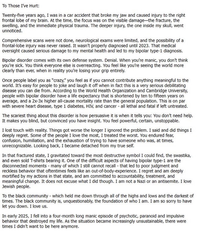 he wrote, adding that his condition does not excuse the harm caused. He also apologized to the Black community, saying he had let people down who supported him throughout his career.