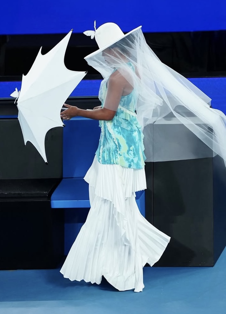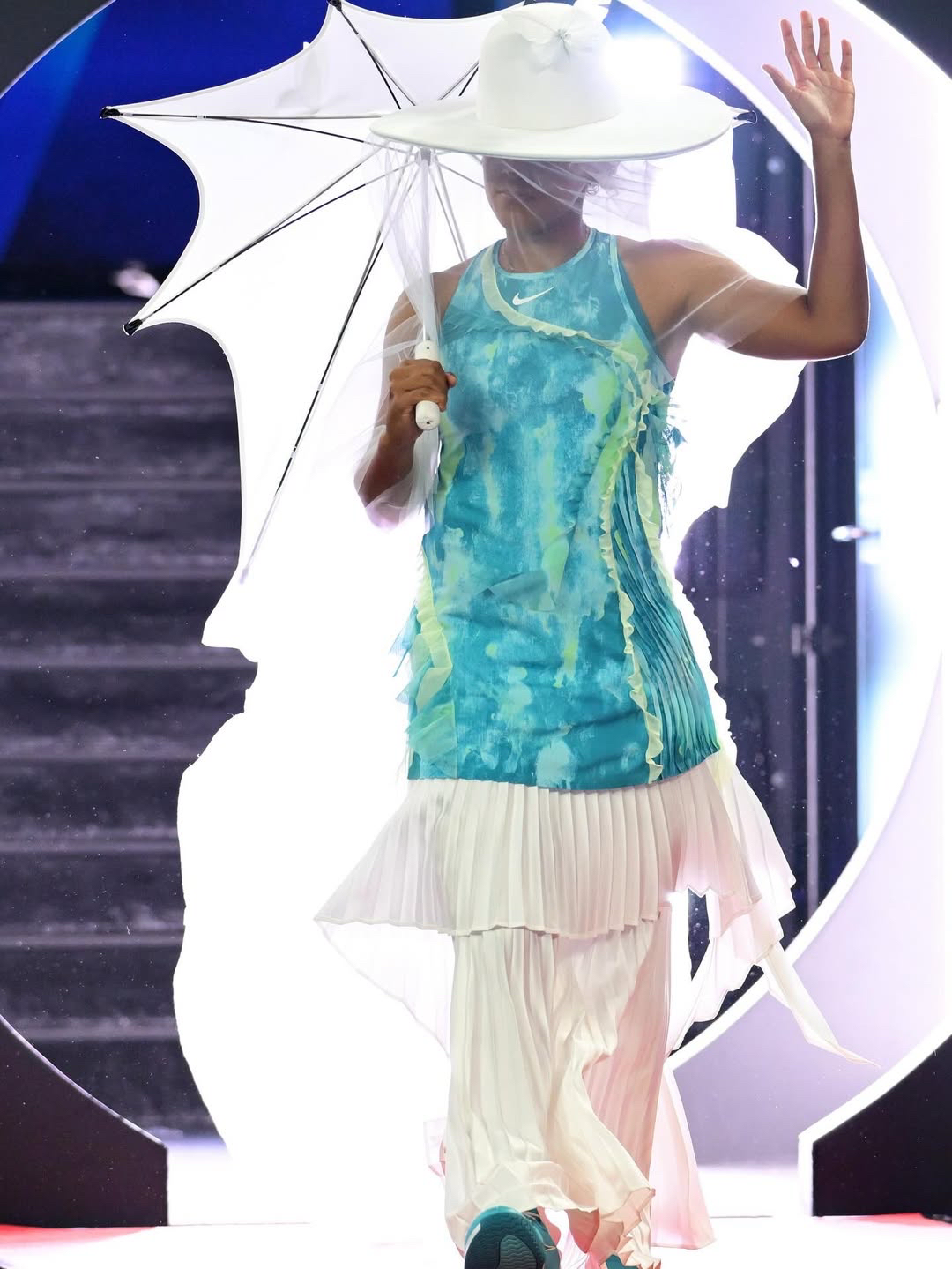 The design was brought to life by a collaboration between Nike, Osaka, Marty Harper, and her designer Robert Wun, who has dressed stars like Ariana Grande, Beyonce, and Cardi B. The top, designed to mimic the shape of a jellyfish, combined shades of turquoise and green, with flowing, tentacle-like details along the sleeves. It was layered over a racerback top and paired with a pleated miniskirt, worn over wide-leg white pants, creating a fluid, ocean-inspired effect.