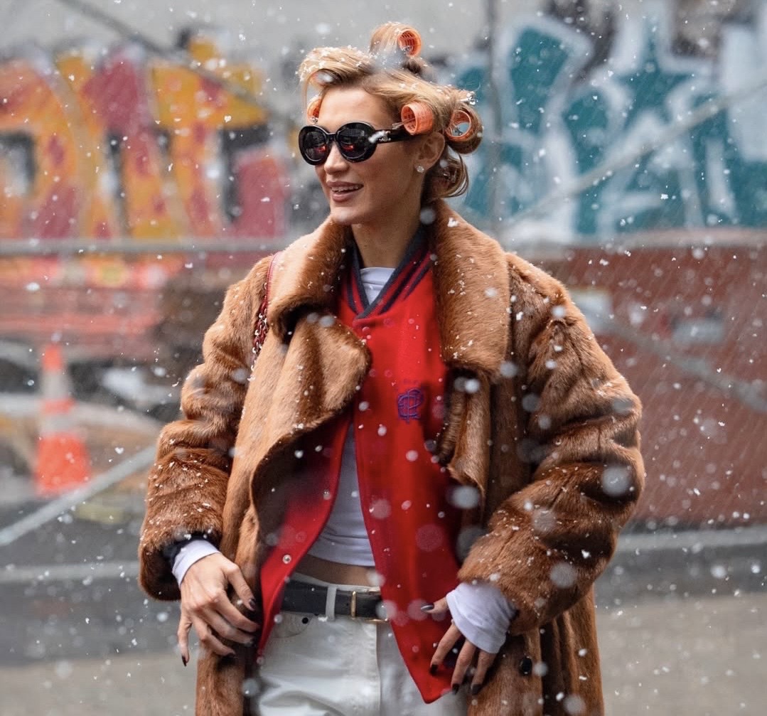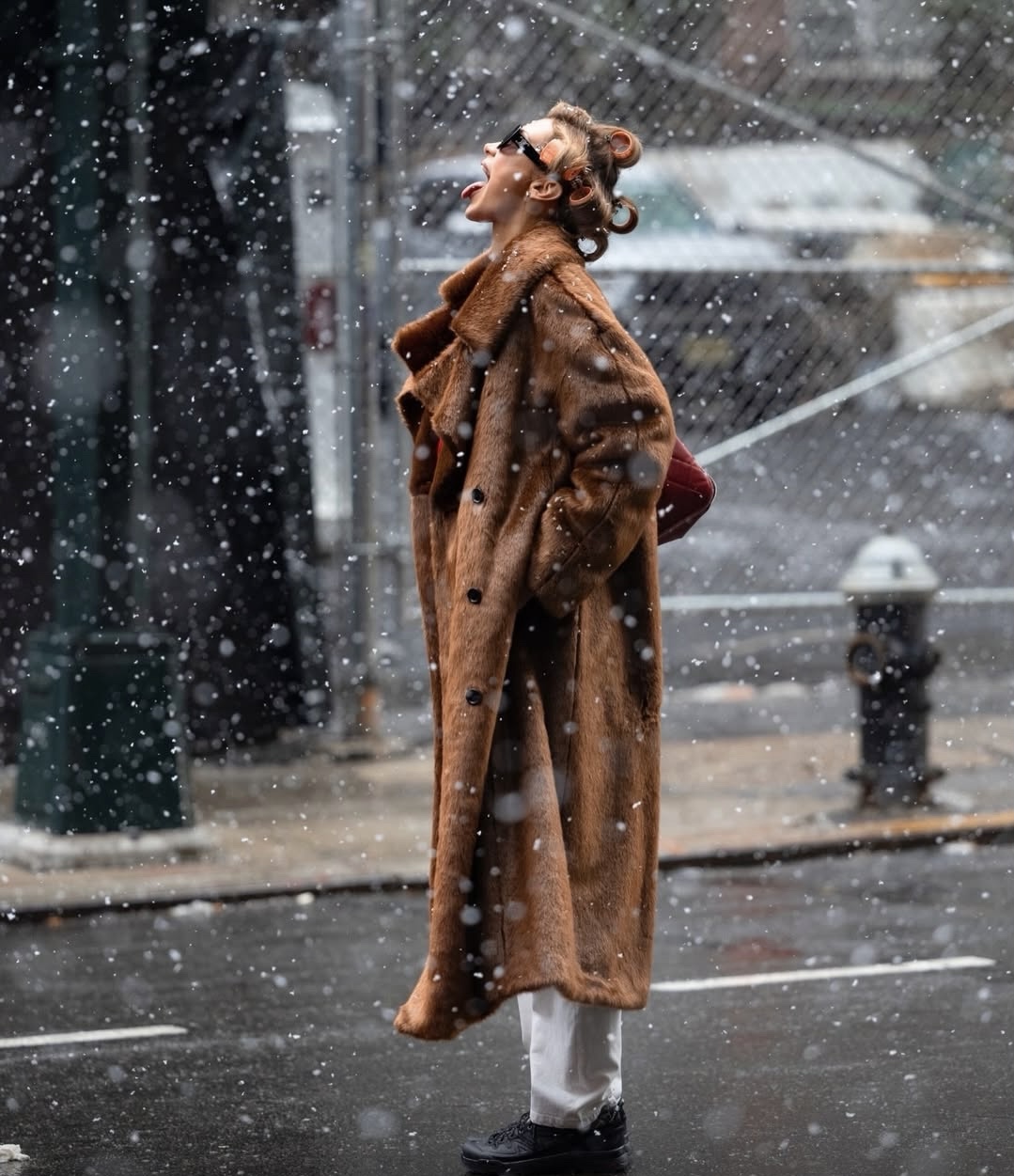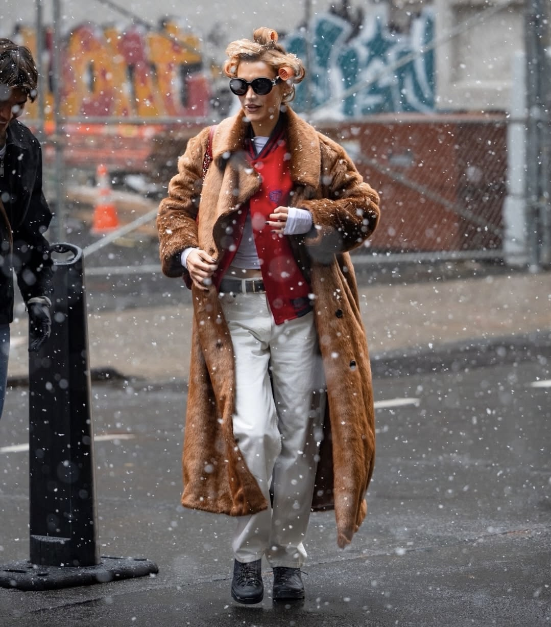 Bella Hadid seemed to be enjoying the snowy weather in Midtown Manhattan, playfully sticking her tongue out to catch a snowflake. She was spotted in a look that combined streetwear and vintage reference.