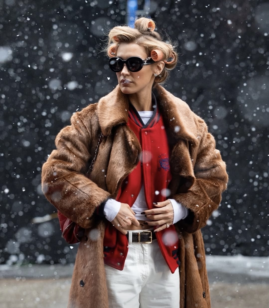 The combination of streetwear, classic designer accessories, and quirky hair details highlighted Bella’s ability to mix casual wear with vintage and Hollywood elements. The overall styling struck a balance between everyday functionality and experimentation. From the coat to the sneakers, every piece showed a considered approach to layering, while the rollers offered an unexpected detail.