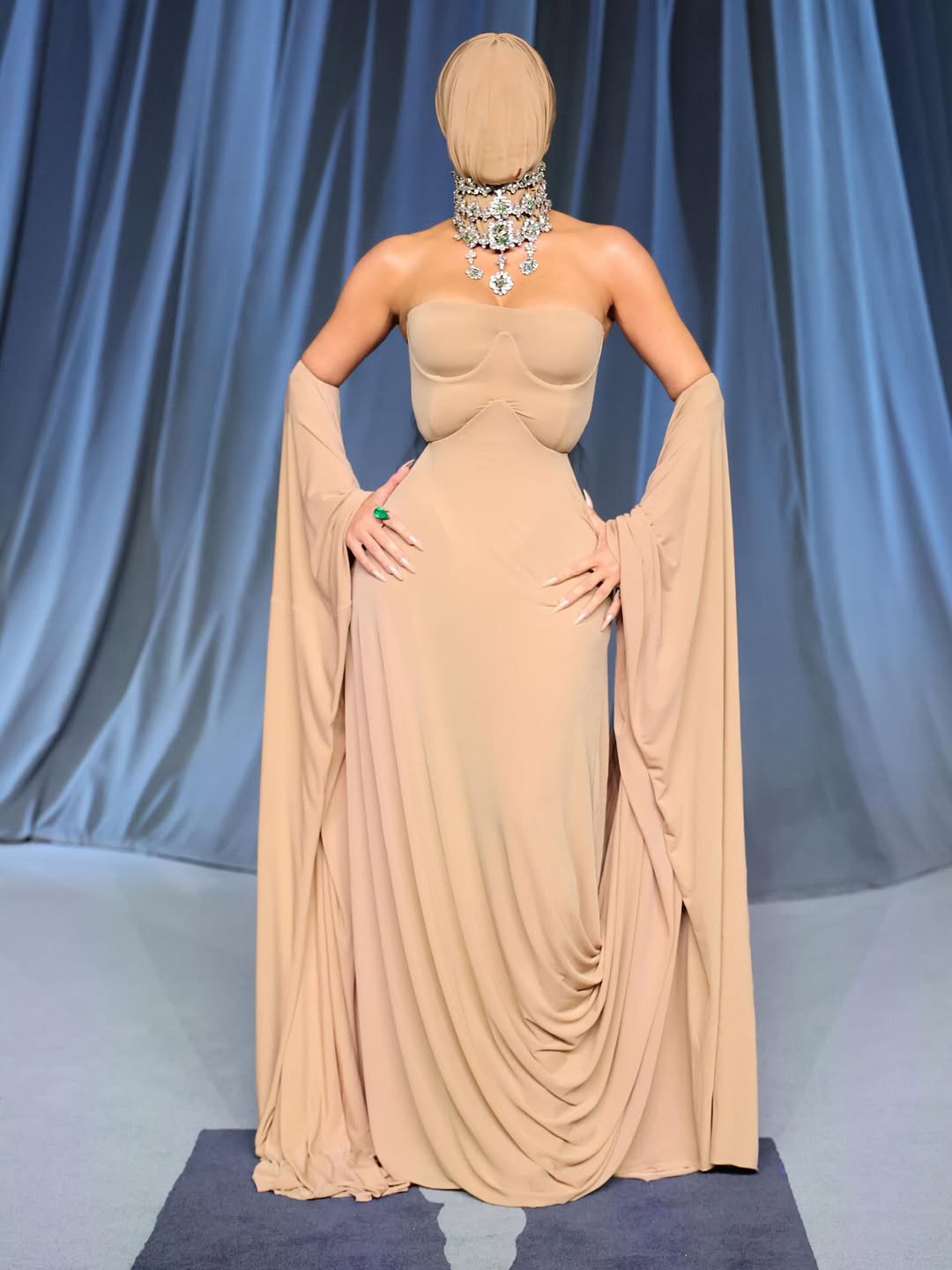 Kim dressed literally in a head-to-toe Maison Margiela couture look: a nude mask covering her entire face and held in place with a crystal-embellished choker, a strapless corseted gown with flowing sleeves connected to the hem of the dress. Her gemstone rings matched the ones on her neck. The look balanced mystery and beauty, the typical Maison Margiela style.
