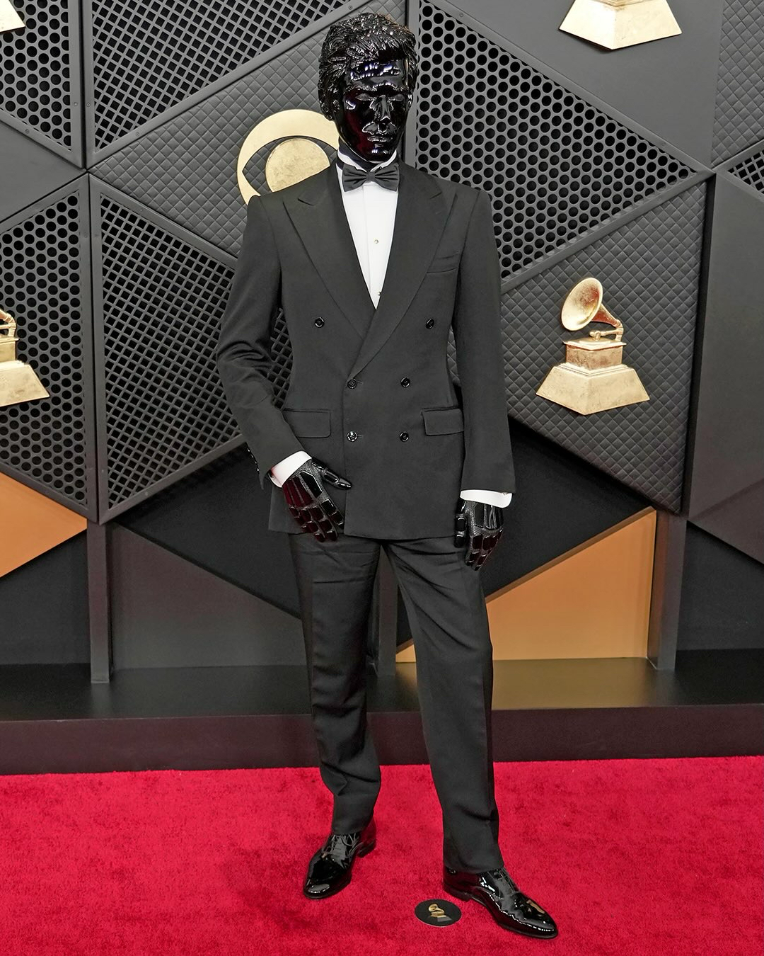 Other stars leaned into shimmer. Olivia Dean chose a black-and-white Chanel gown with intricate beading on the upper half and feathered details leading into a voluminous skirt. Teyana Taylor wore a Tom Ford gown. Men also wore shimmer. Sombr appeared in a Valentino suit covered in purple and silver sequins, paired with a thin lace shirt and pointed shoes.