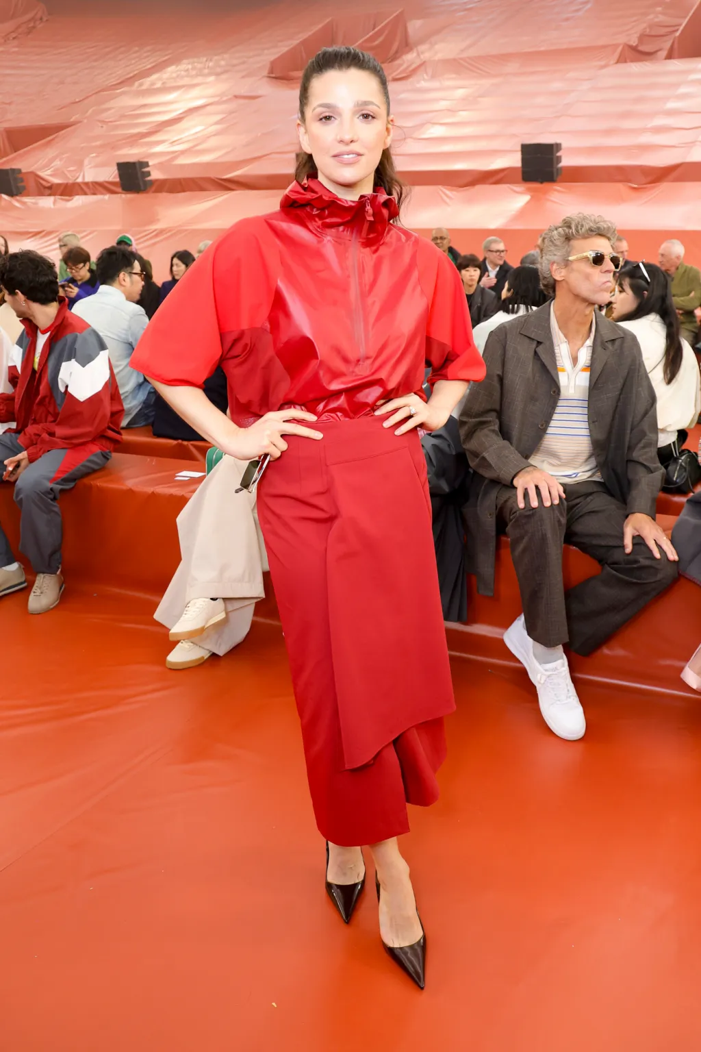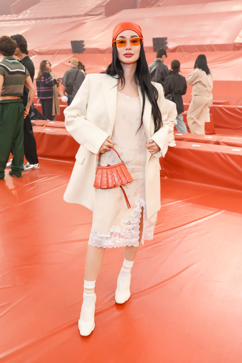 Pleated details were seen repeatedly among several female guests at the show. Mélanie Laurent arrived in a green collared top paired with matching shorts, white pumps, and an orange pleated bag. Heart Evangelista wore an off-white gown layered underneath an oversized coat, accessorizing with orange glasses, a coordinating scarf, and an orange handbag with the spliced design.