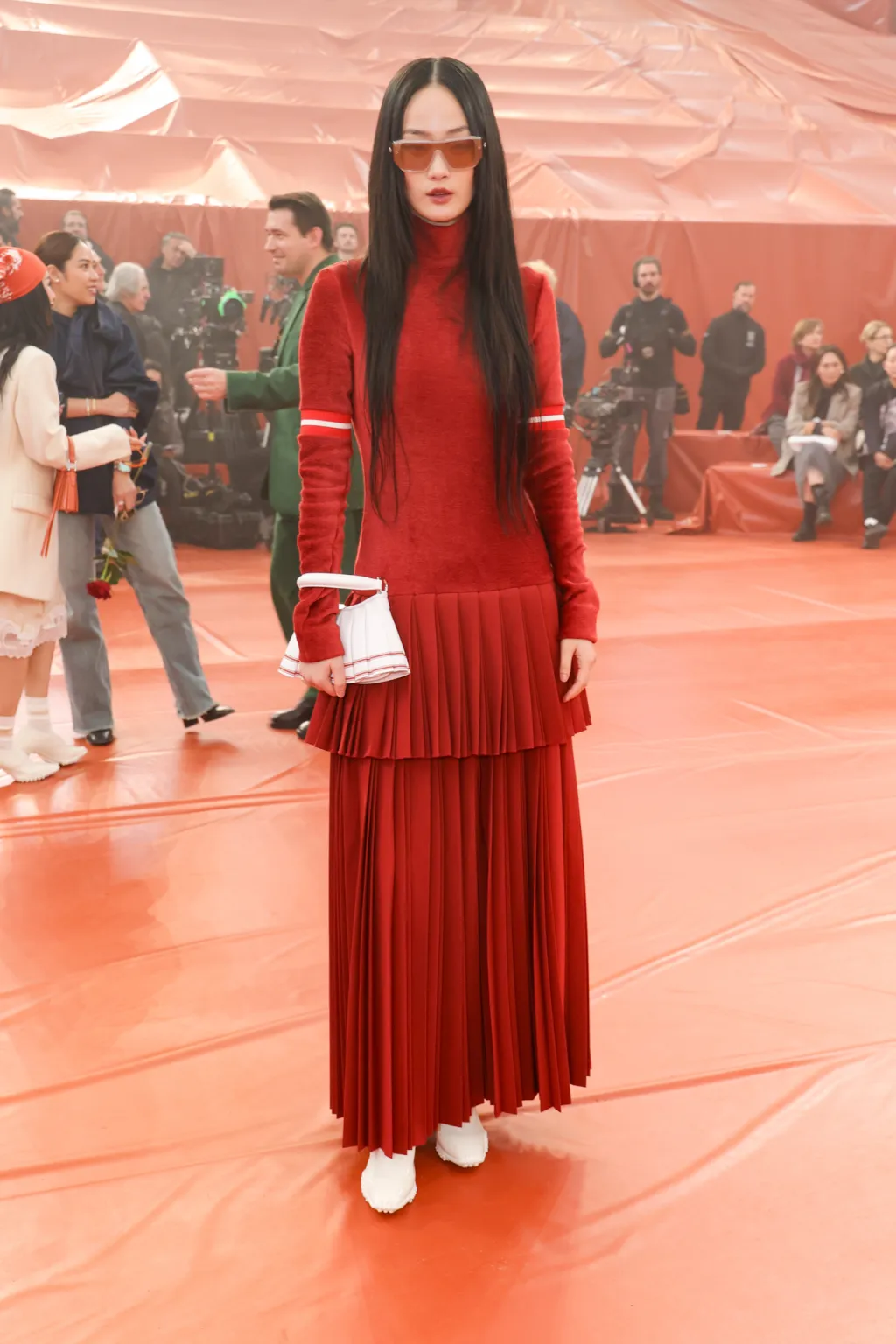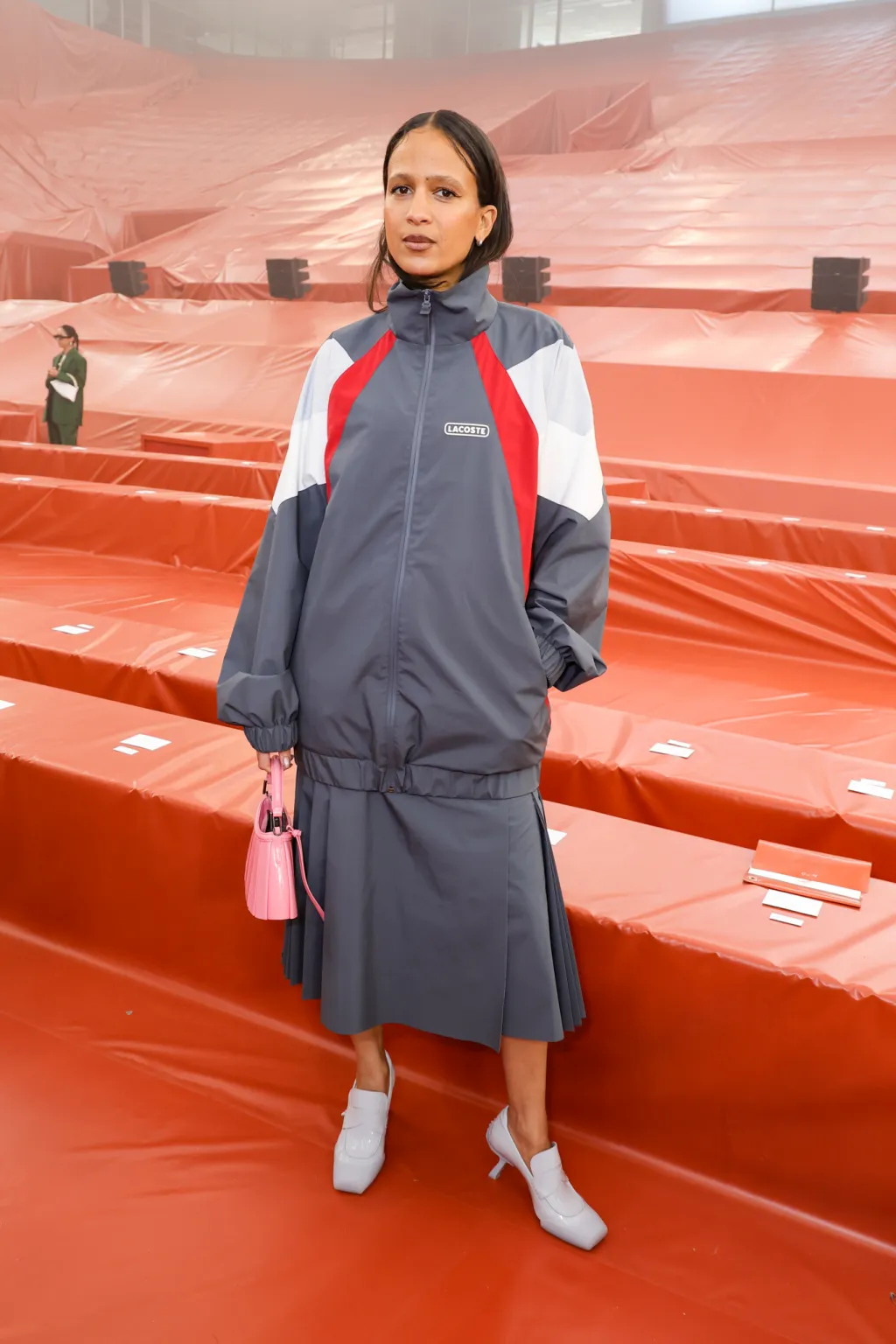 Hyunki opted for a red two-piece set, featuring a top with a split hem and a fully pleated skirt, paired with one of the brand’s signature bags, while Mati Diop styled a Lacoste track jacket with a midi skirt and carried a pink bag with the same pleated design.