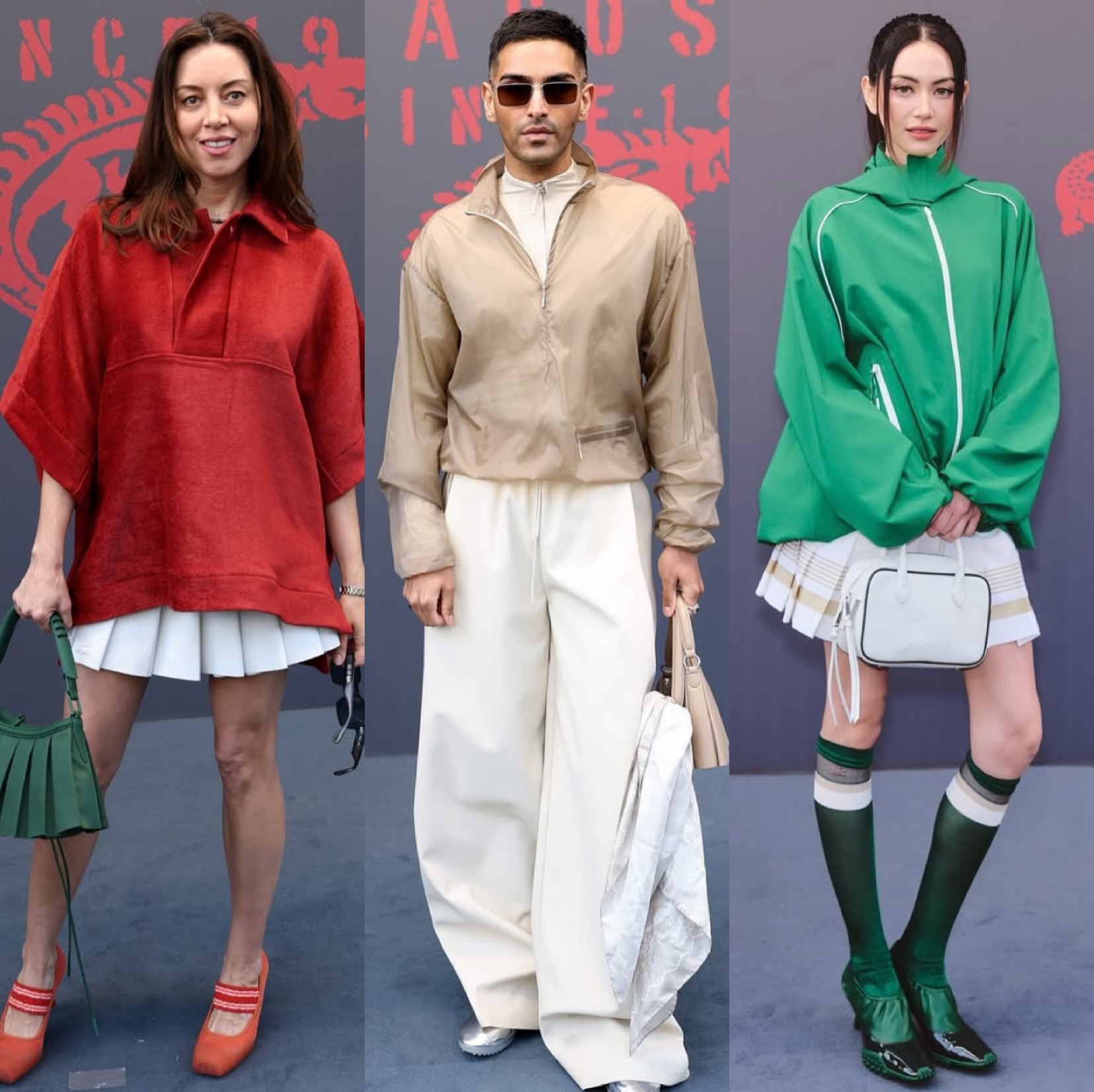 Aubrey Plaza wore a white folded mini skirt paired with an oversized red Lacoste top featuring a pointed collar. She paired the look with orange hybrid heels from Lacoste collection and carried a dark green bag.