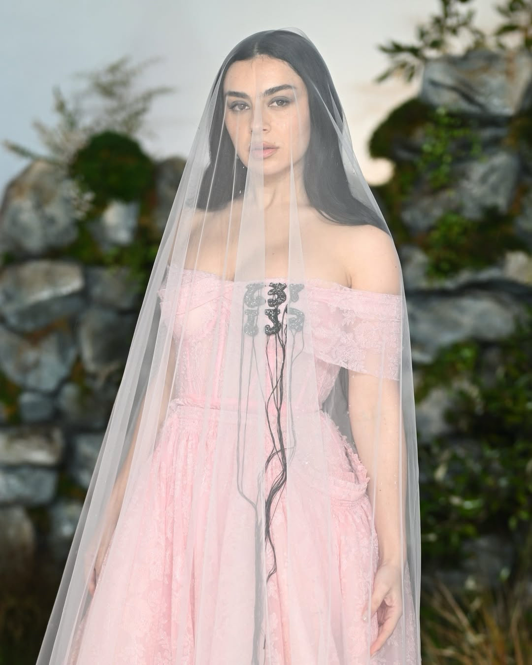 Charli XCX wore a pink gown. The look featured an off-shoulder neckline, designed with pink floral lace details. The gown was fitted through the bodice with a belted waist, while the skirt fell into a voluminous shape. A black crystal embroidery was placed on one side of the bustier.