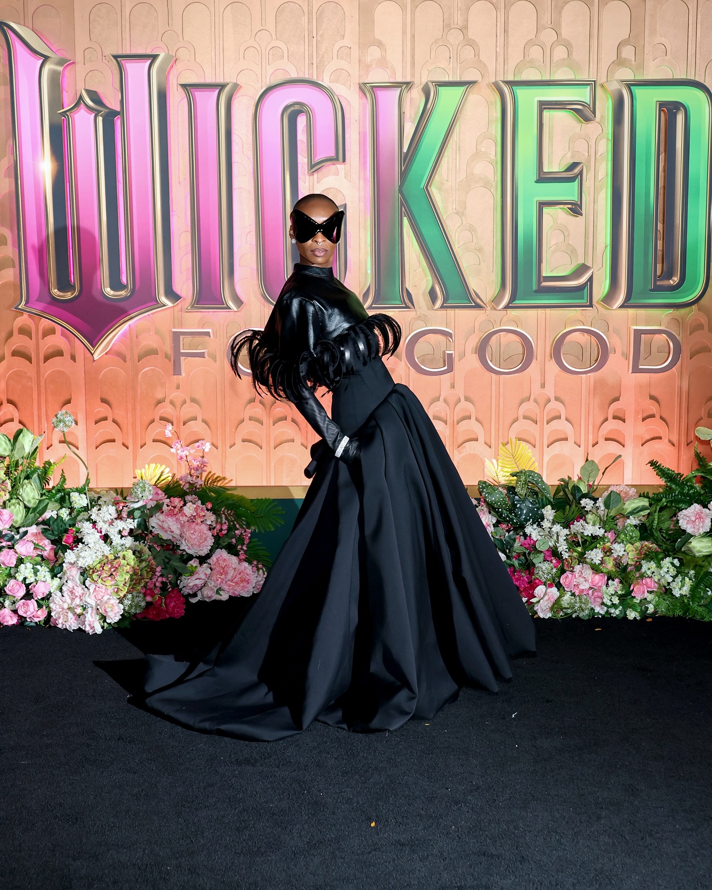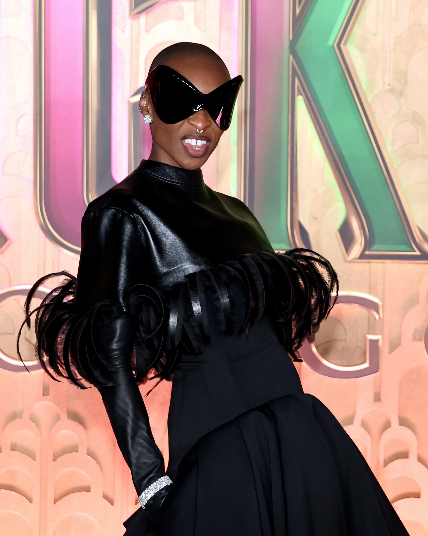 She wore a sculptural black turtleneck gown with long leather sleeves. It also had a pleated drop waist skirt that flowed behind her and a feathered detailing around the bust area. Cynthia told Harper’s Bazaar that she wanted the dress to feel like Elphaba’s take on couture. “If she were to attend a premiere, this is how she would show up,” she explained, giving a nod to her character on screen.