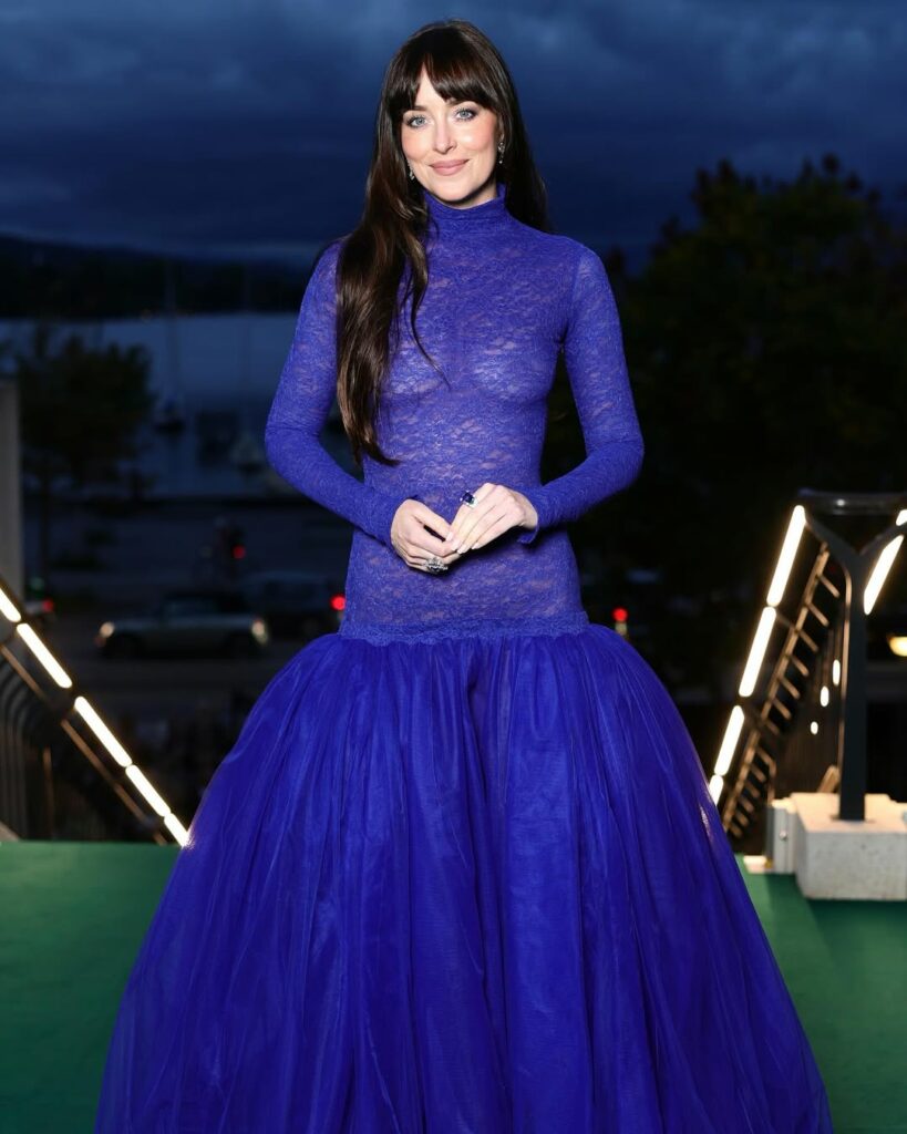 For the opening gala, Johnson wore a custom Gucci gown. The design featured a high neckline and long lace sleeves, paired with a sheer embroidered bodice. From the hips, the silhouette dropped into a layered tulle skirt, giving the look structure and presence. The rich blue tone of the gown underscored its seasonal edge, while the contrast between the transparent top and voluminous skirt gave the ensemble a modern balance.
