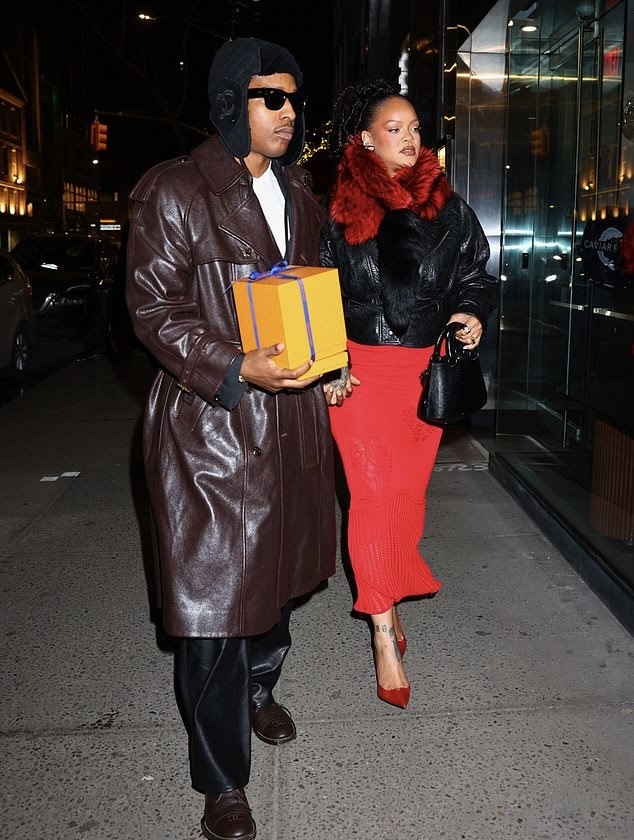 A$AP Rocky walked by her side in a chocolate-brown leather trench coat tied at the waist over a white shirt, pairing it with black trousers. He wore a fuzzy trapper hat and brown leather shoes, both from Chanel, leaning into a relaxed winter-ready style. Rocky was also spotted carrying a gift in a box from Louis Vuitton.