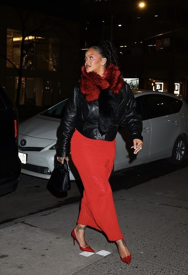 Rihanna stayed true to the theme of the evening, stepping out in a bold red look from head to toe. The Fenty Beauty founder wore a long red knit dress designed with a semi-sheer panel along the lower half. She layered the dress under a cropped glossy black leather jacket from ERL’s fall 2026 collection, tied at the waist with its matching thin belt. A red and black fur scarf was wrapped around her neck.