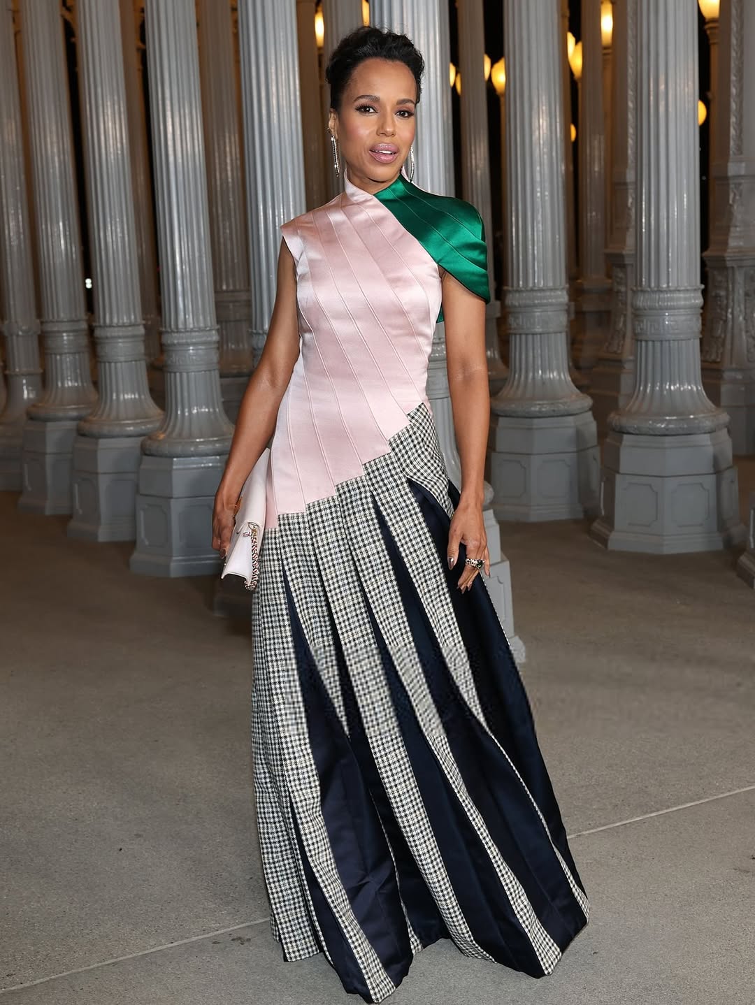 Kerry debuted a gown from Thom Browne’s fall 2025 collection. Styled by Rob Zangardi and Mariel Haenn, her dress featured an asymmetric cut, consisting of a pink and green fabric, It transitioned into a black and white pleated skirt.