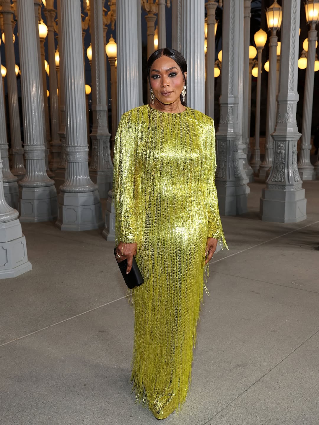 Angela debuted a yellow-gold gown by Gucci. It was covered in shiny beaded fringe. The long-sleeved design had a slit revealing her gold platform heels. She paired the outfit with dangling earrings and a black clutch.