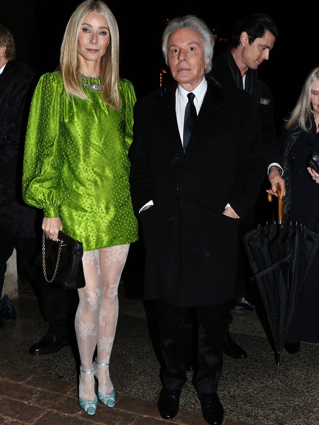 She styled the dress with white floral-print tights that first appeared in the Valentino Pre-Fall 2026 lookbook. Gwyneth carried a black handbag and completed the outfit with pale teal pointed-toe heels with delicate ankle straps.
