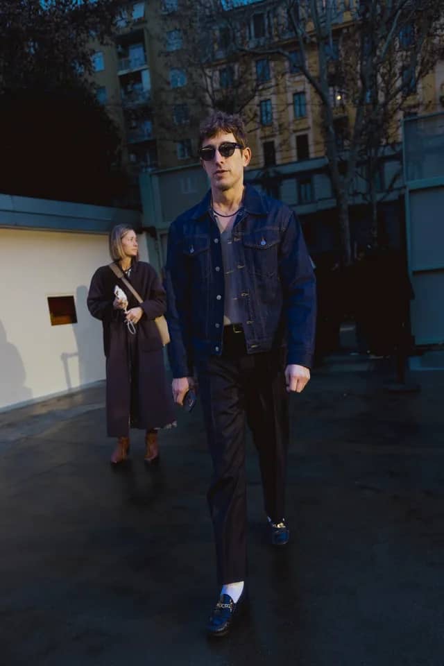Photographed by Acielle Tanbetova, guests outside the venues were seen in a variety of outfits, but one thing many had in common was jackets and coats. From long overcoats to tailored jackets and trench coats, outerwear played a major role in men’s styling this season, influenced by the winter weather in Milan. Some layered knit sweaters over tailored suits. Others leaned into a more casual look, pairing jeans or plain trousers with coats or leather jackets.
