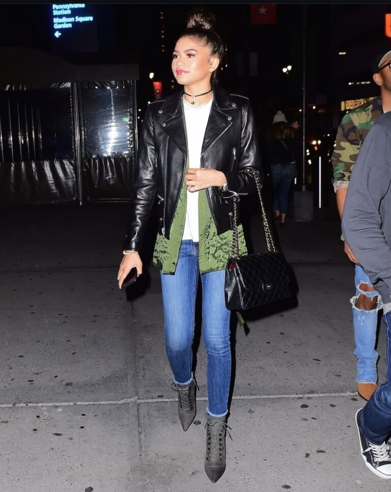 Fuzzy teddy coats or shearling jackets make chocolate brown jeans feel cozy. Layer a tee, sweater, or turtleneck underneath. Ankle boots, loafers, or sneakers complete the winter look.