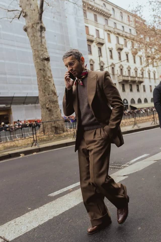 Neutral palettes were popular across many outfits, with shades like grey, brown, and beige. Deeper colors like dark burgundy appeared in suits and paired with black coats, adding contrast. Accessories like vintage scarves were tied around the neck, while caps, patterned ties, crossbody bags, and glasses tied many outfit together.