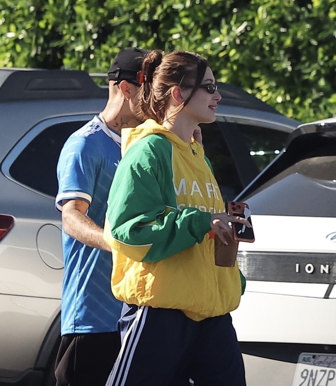 Hailey Bieber still wore the same Marty Supreme jacket from the Instagram post; a yellow, green, and white nylon piece featuring the movie title and an orange star across the chest. She paired it with blue Adidas three-stripe track pants and finished the look with black Skylark mules.