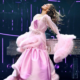 She was also seen in a floor-length pink satin gown with a sheer fur-trimmed robe. Other outfits included lingerie-inspired costumes, adorned with beaded crystal droplets.