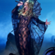The singer came in with a cat lace bodysuit, nodding to her recent role in Kiss of the Spider Woman. The figure-hugging corset bodysuit was designed with sheer black lace material that hugged her entire frame all the way down to her ankles. The sleeves were designed with same black lace that created a web-like diaphanous cape trailing beside her as she lifted her arms. Behind her head was the same web-like motif, giving the illusion of her being in the middle of a black spider web.