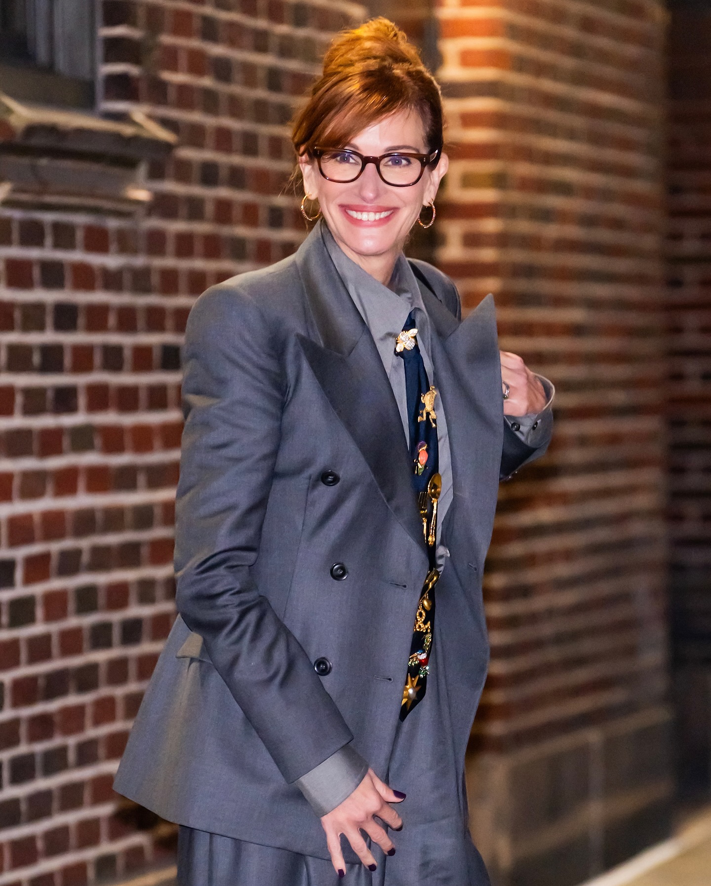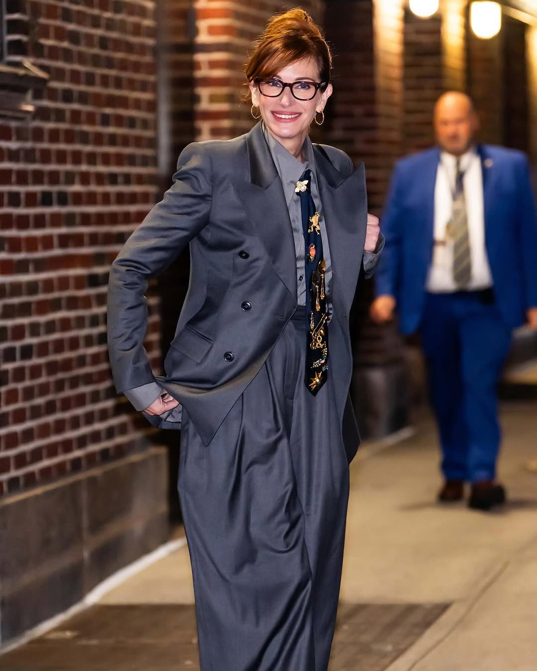 Julia Roberts restyled a look from the 1990 Golden Globes. The actress wore a grey Giorgio Armani suit for “The Late Show with Stephen Colbert”, where she was promoting her new film “After the Hunt”. The outfit was almost identical to the one she wore more than three decades ago.