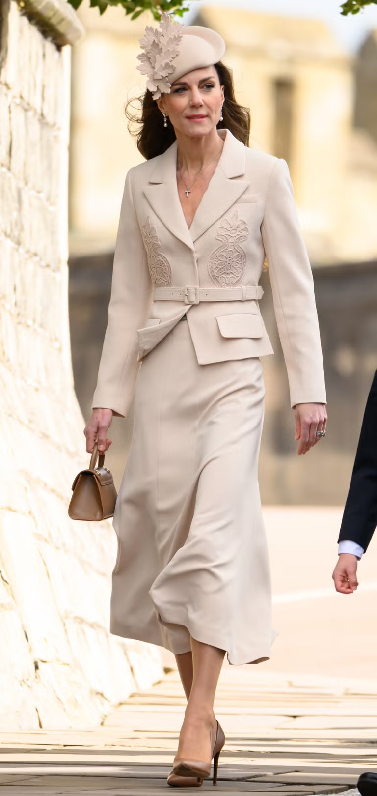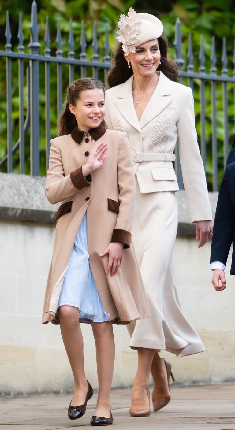 She completed the look with Ralph Lauren gold calfskin pumps, adding a warm contrast to the cream palette, and carried a small toffee-colored bag by London-based designer DeMellier. Walking alongside her daughter, Princess Charlotte who wore a chocolate brown coat layered over a blue dress, a quiet nod to her mother’s long-favored Easter color, even as Kate Middleton departed from her signature shades this year.