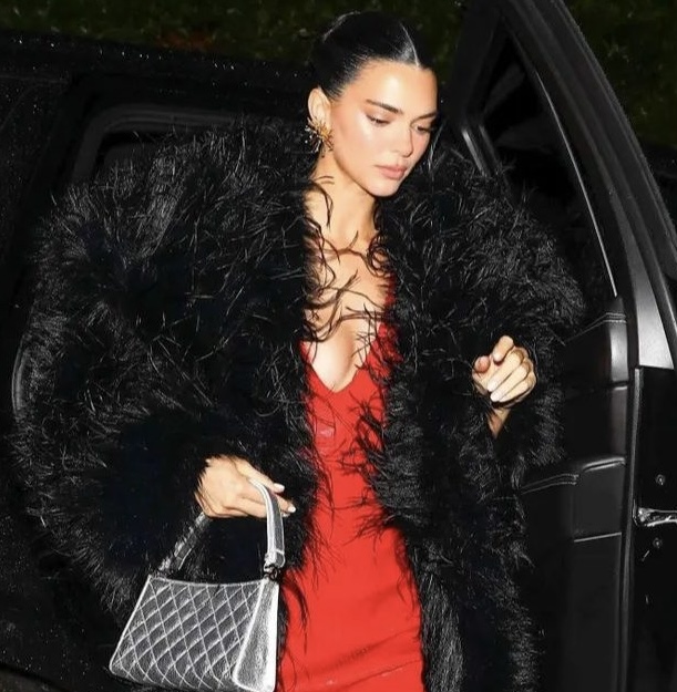 The sleeveless dress had a plunging neckline that added a sultry edge to the shiny fabric. Kendall layered the knee-length gown with an oversized fuzzy black coat.