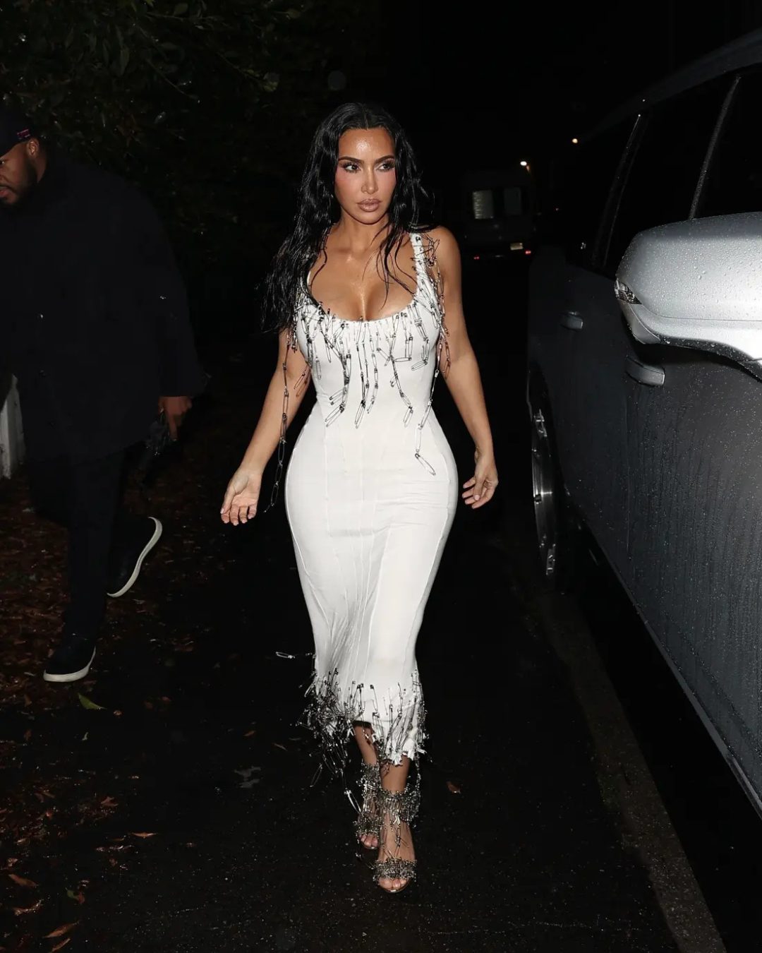 Kim styled her hair in a wavy, wet finish, giving a nod to her 2019 Met Gala appearance. The dangling safety pins on her bodycon dress were also reminiscent of the dripping-crystal effect of the latex gown she wore back then.