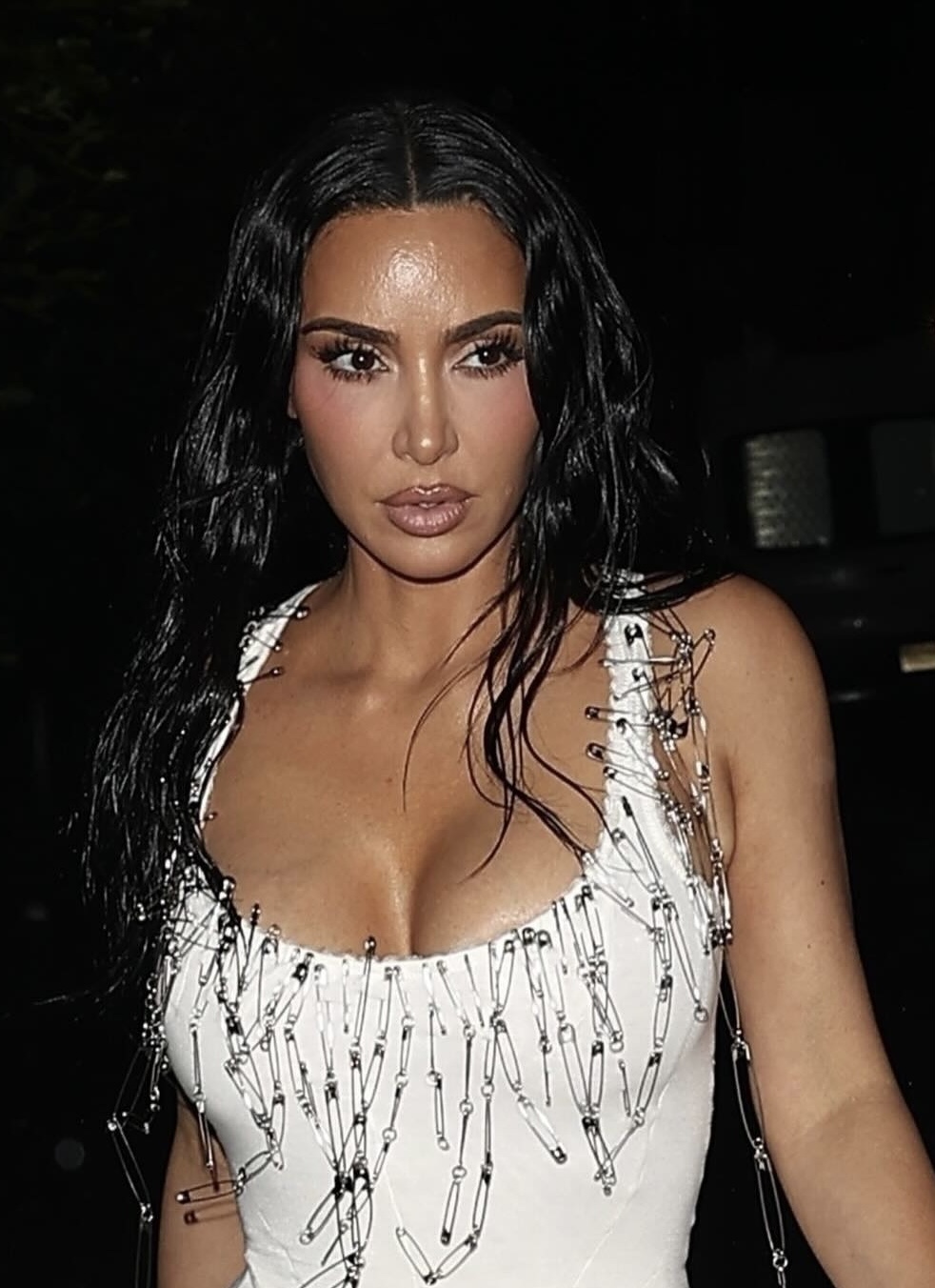 Kim styled her hair in a wavy, wet finish, giving a nod to her 2019 Met Gala appearance. The dangling safety pins on her bodycon dress were also reminiscent of the dripping-crystal effect of the latex gown she wore back then.