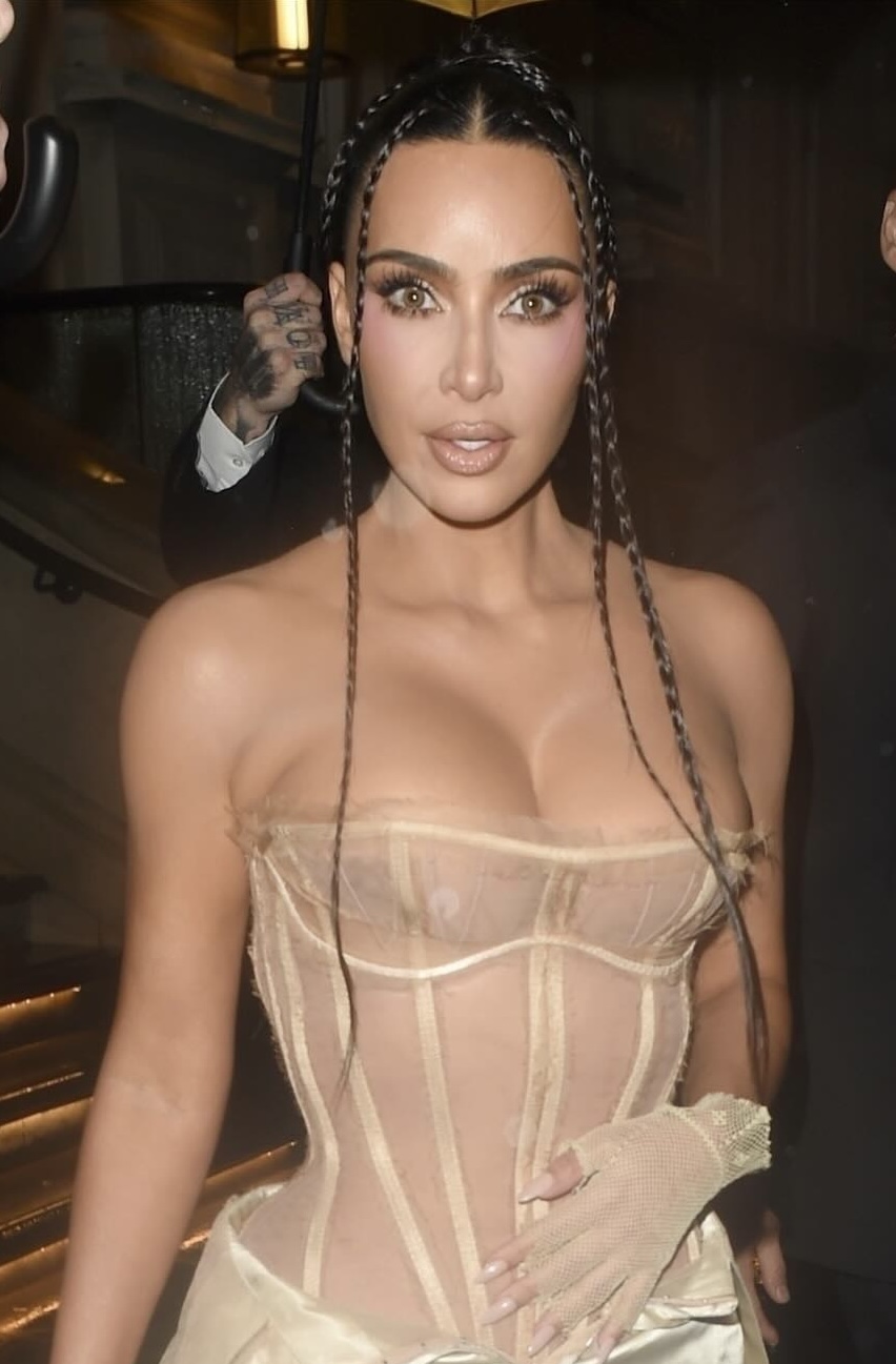 For the official after-party, Kim changed into something lighter and daring still from the London based designer, Findikoglu. A champagne sheer corset with boned bustier and a matching satin lace miniskirt. She kept her bronzed glam intact from the premiere but switched up her hair with long mini braids. She completed the look with lace-up gold stilettos and mesh gloves.