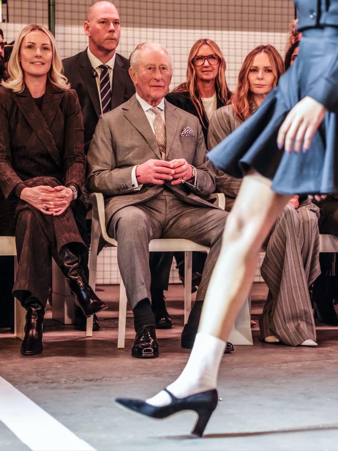 The King was seated in the front row next to fashion designer Stella McCartney and Laura Weir, CEO of the British Fashion Council. He wore a gray suit with a single-breasted jacket layered over a long white shirt, paired with matching trousers with folded hems. He completed the look with a patterned bronze tie and black shoes.