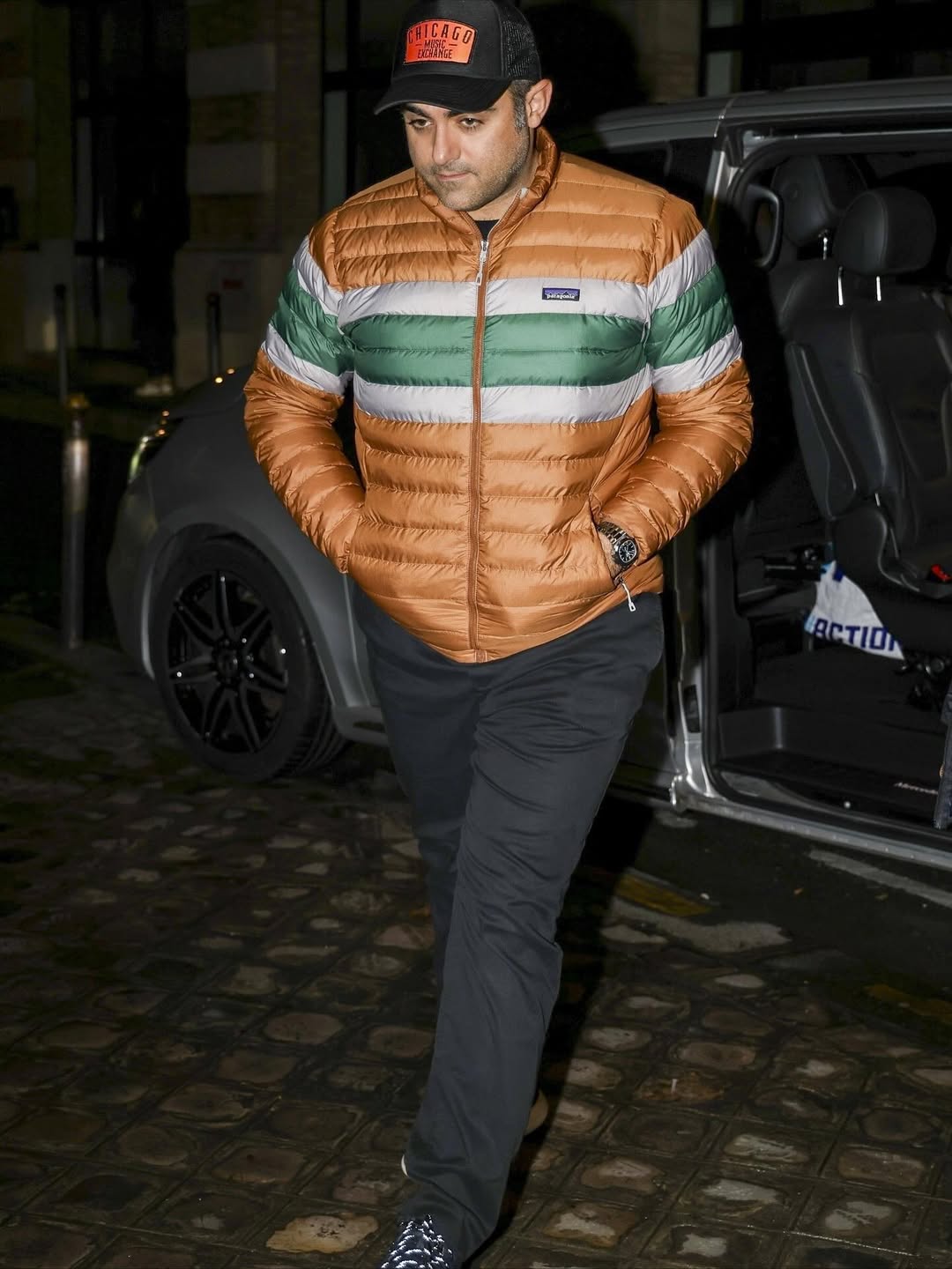 Michael kept his look casual. He wore a striped Patagonia puffer jacket in orange, green, and white, paired with black trousers and sneakers. He also wore a black “Chicago Music Excellence” baseball cap. He added a watch, keeping his style simple next to Gaga’s more elevated styling.