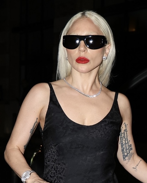 Gaga carried a black Hermès Kelly, a bag she frequently carries, and finished her look with Balenciaga sunglasses. For jewelry, she wore a diamond necklace, matching earrings and a watch, along with her custom Sophia Jewelry engagement ring. Her red lipstick and blonde hair completed her appearance.