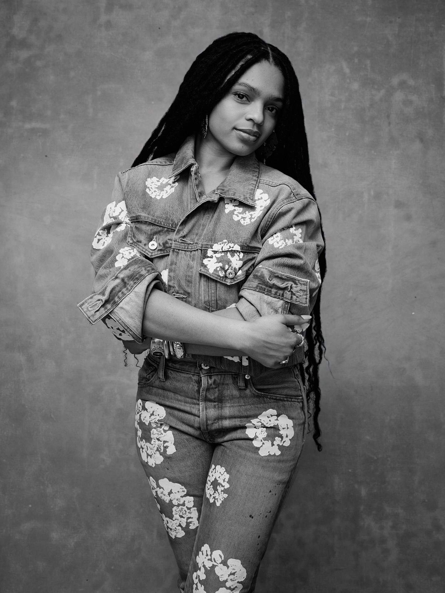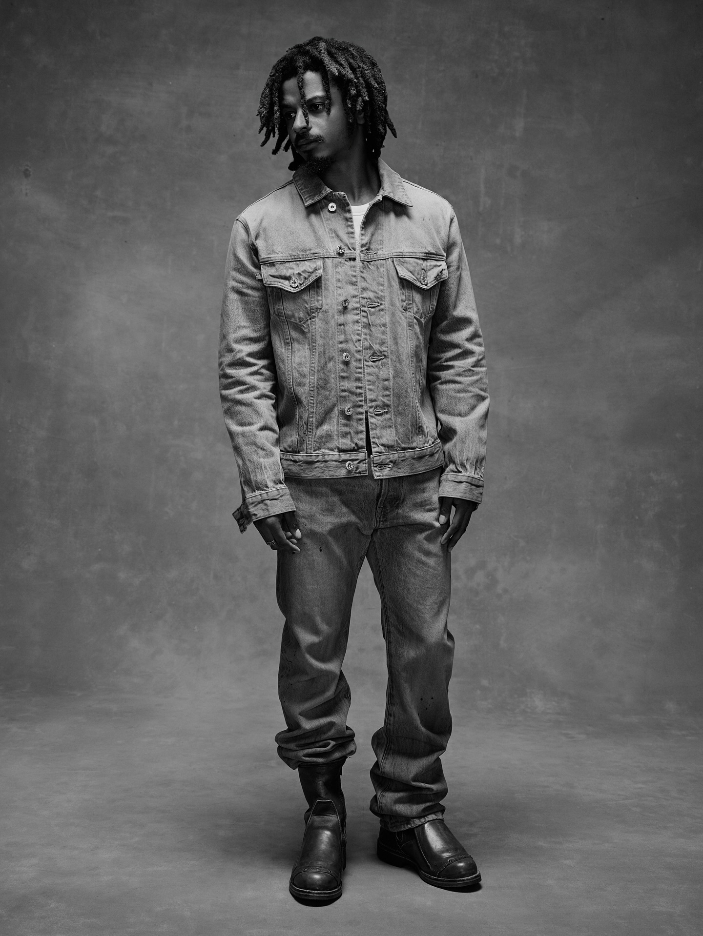 Hill’s look centers on layered denim construction, with the embroidered detailing positioned within the outfit. Visible stitching and surface texture are highlighted through the monochrome photography, allowing the texture of the jeanswear to remain the main point.