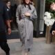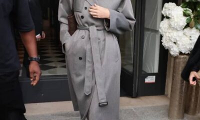 She paired the look with H&M Studio thigh-high boots, an unexpected high-street choice among her usual luxury picks. Their deeper brown tone grounded the outfit, and the clean cut refined her outline. To finish, she carried Saint Laurent’s Baby Icare bag, oversized and slouchy enough to offset the outfit’s sharp fit and give it real-world grounding.