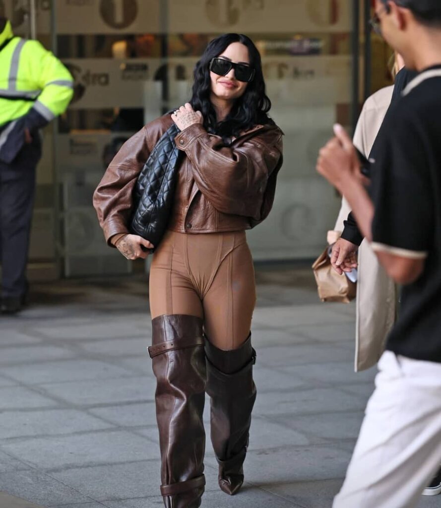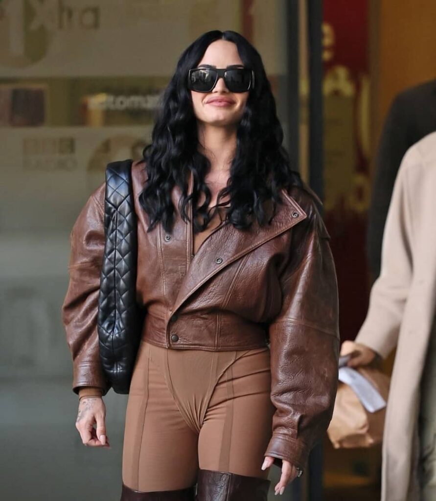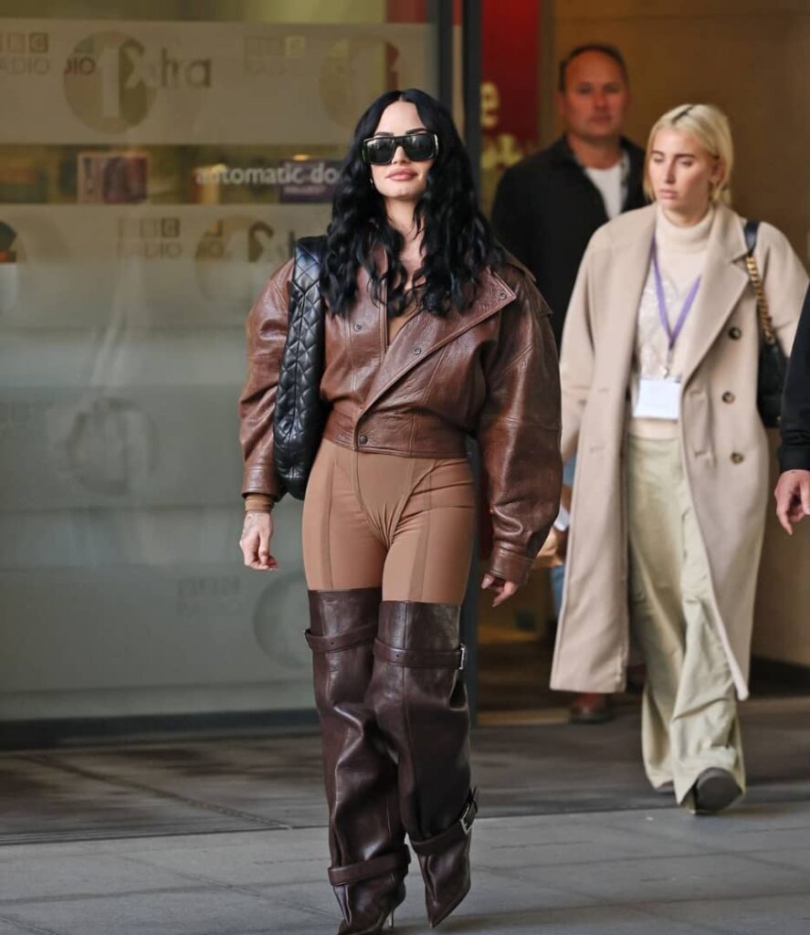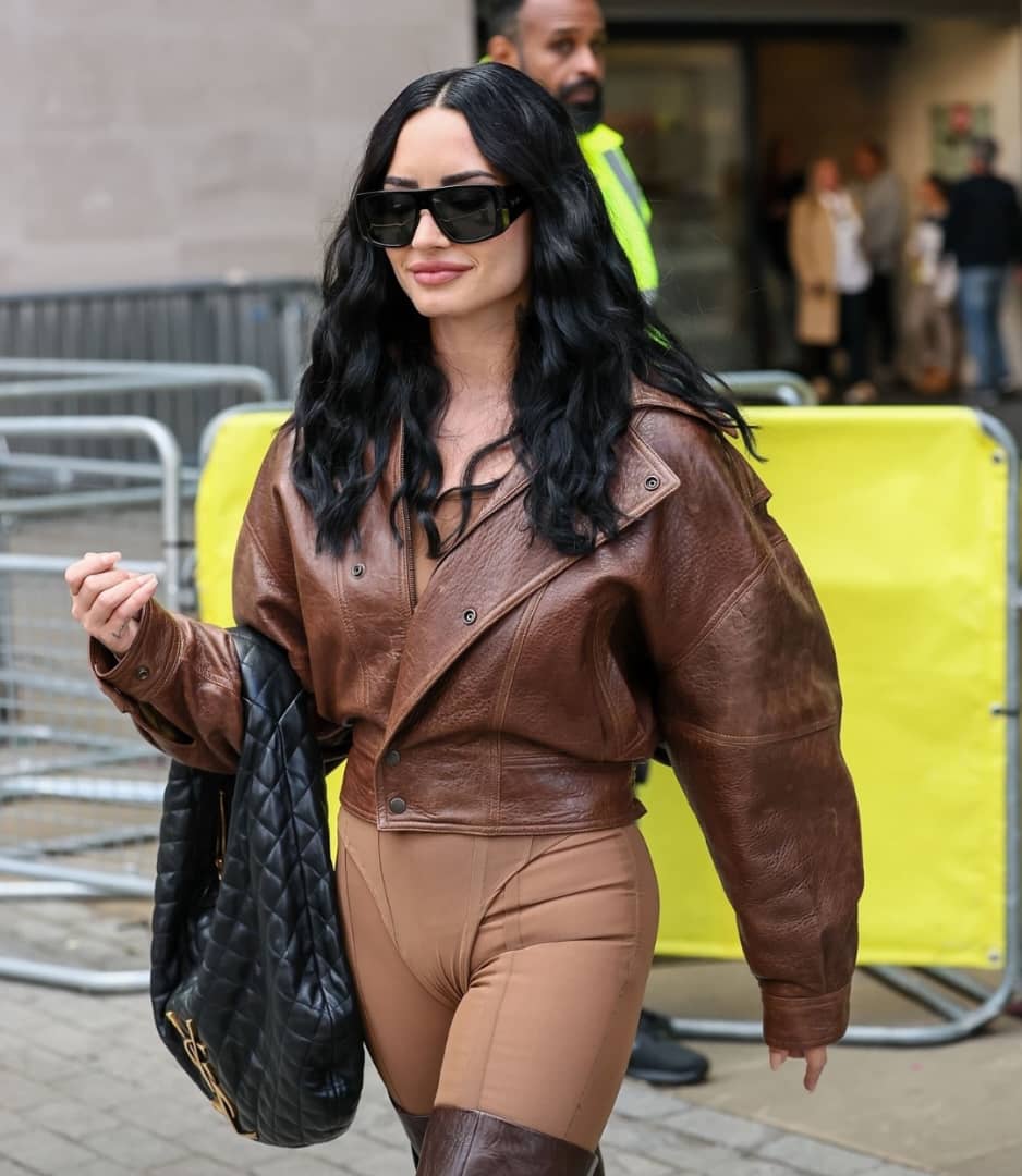 London got the sharp end of Demi Lovato’s new style phase this week: structured, tonal, and unapologetically exact. Stepping out ahead of her BBC Live Lounge stop, she pulled together one of her most considered off-duty looks in months. A nude-tone bodysuit paired with panelled tights was topped with a cropped brown leather jacket that broke up the monotone base and added structure where it mattered.