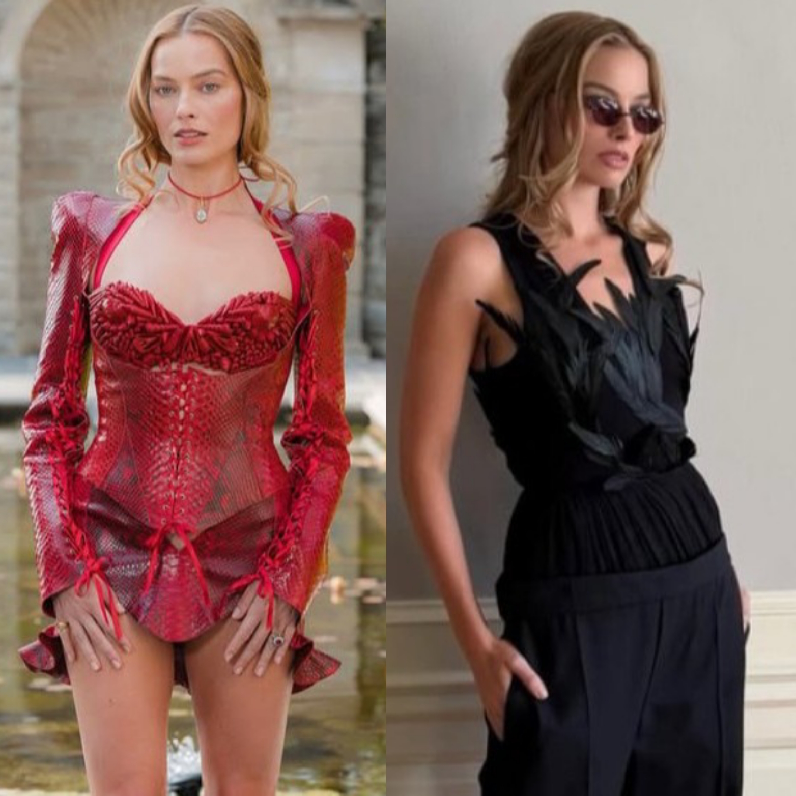 At the global junket photo call in LA, Robbie wore a red snakeskin mini dress by Dilara Findikoglu FW25, featuring a corset-style top and matching micro skirt. The outfit was paired with classic heels and minimal accessories.