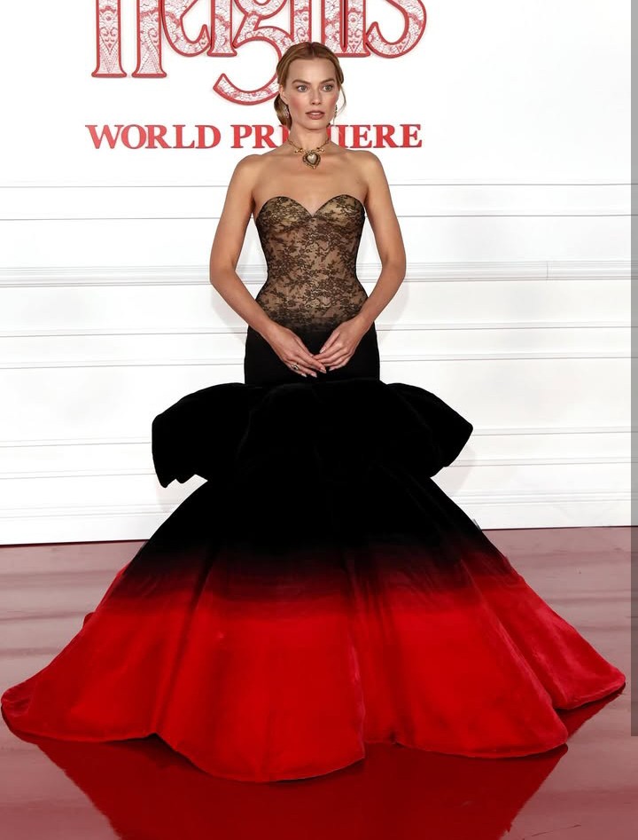 For the LA premiere of Emerald Fennell’s romantic epic, the actor wore a dramatic custom gown from Schiaparelli’s Spring/Summer 2026 haute couture collection, featuring a lace bodice and a long silhouette with a subtle train, first seen on the Paris runway just days earlier.