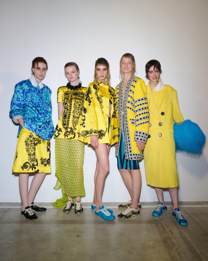 Accessories followed the same rule. Big shaggy clutches, patterned sneakers, and chunky shell necklaces gave the looks personality without tipping into costume. You could easily see the furry blue clutch becoming that one statement piece you carry all season, or the sneakers grounding a work outfit on casual Friday.