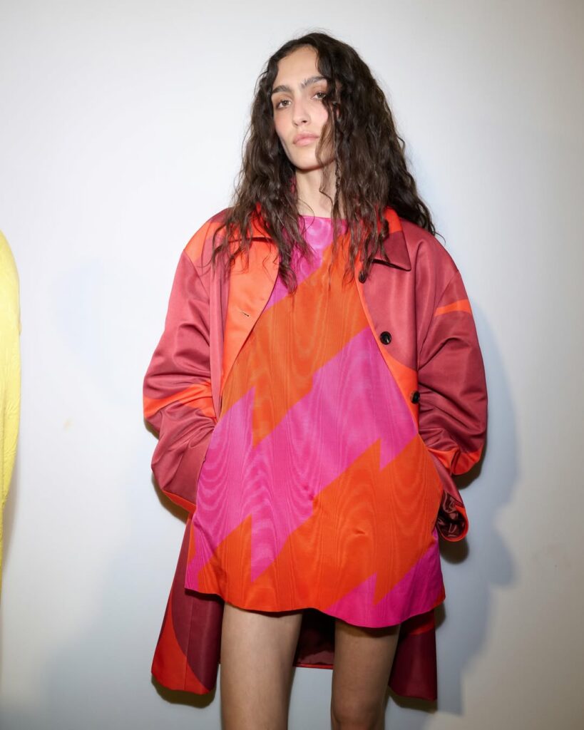 The color story was just as fearless. Turquoise with brown, scarlet with lime green, lavender against kelly green: pairings that shouldn’t work but somehow did. Instead of overwhelming, the mix looked sharp because the shapes were kept simple. It was a reminder that you don’t need to mute your wardrobe to make it practical.