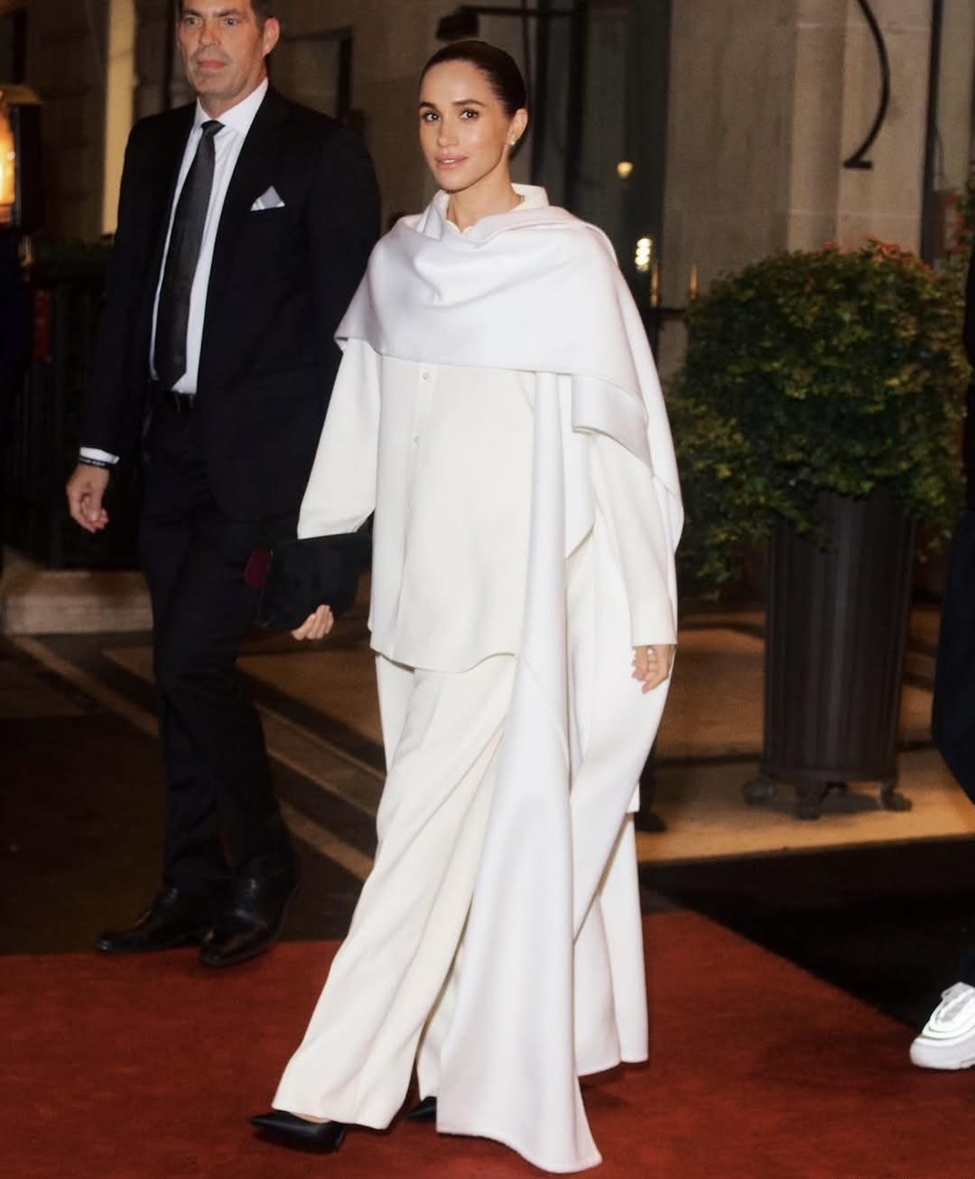 She arrived in a white monochrome set from Balenciaga. The outfit includes a long-sleeved button down top with loosed straight trousers. Hung across her shoulders was a cape-like drape that flowed all the way down to the ground behind her. With her hair styled in a sleek low bun, she paired the attire with pointed-toe black heels.