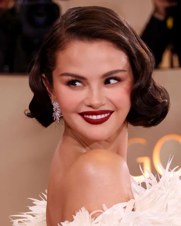 Selena Gomez tapped into vintage glamour at the Golden Globes, with a bold burgundy lip as the centerpiece of her look. Her makeup consists of a toned eye look with matte skin finish, capturing a modern homage to the silver-screen icons of the 1940s, according to her stylist Renato Campora.