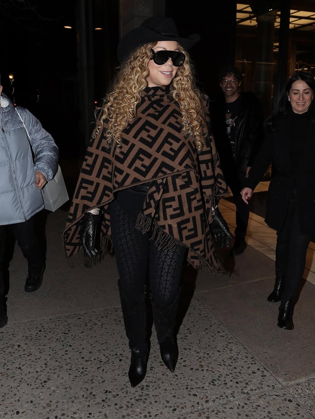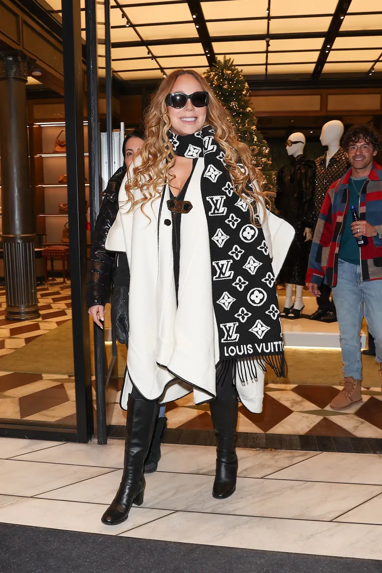 Styled by Wilfredo Rosado for her first outing in Aspen, Mariah Carey stepped out in a fitted ski suit topped with an oversized Louis Vuitton poncho. She wrapped a black-and-white Louis Vuitton monogram scarf around her neck and instead of her leather gloves, she opted for padded ski mittens, completing the look with matte black leather boots.