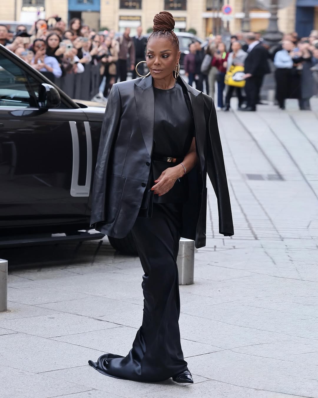 Janet reunited with her niece Paris Jackson in a structured leather top layered with a blazer and paired with a flowing silk maxi skirt.